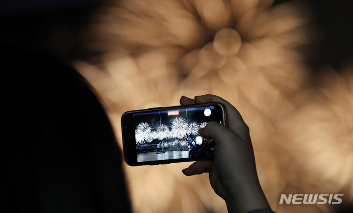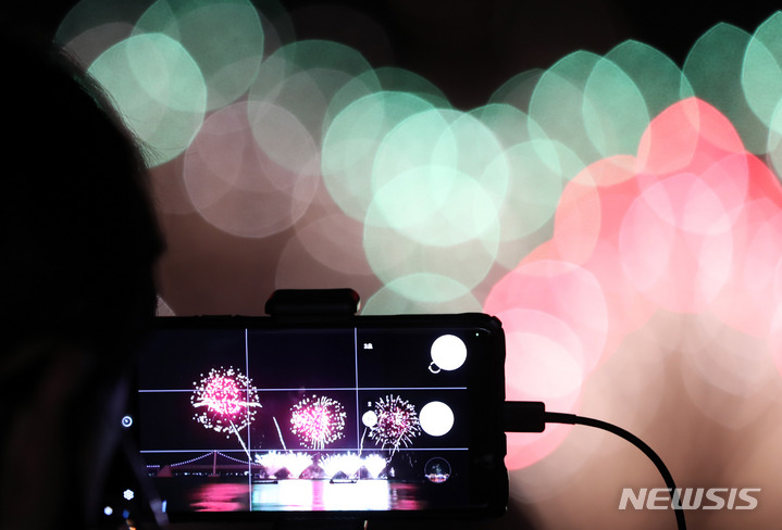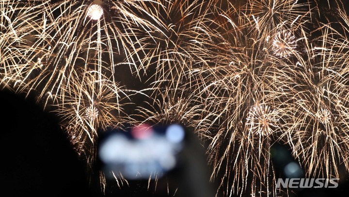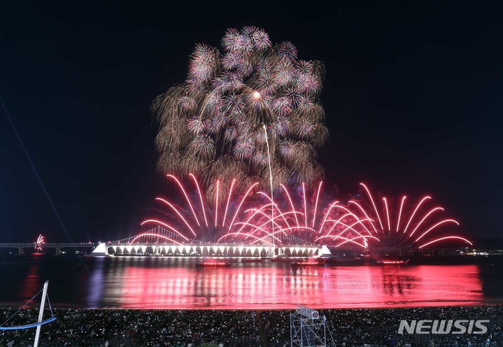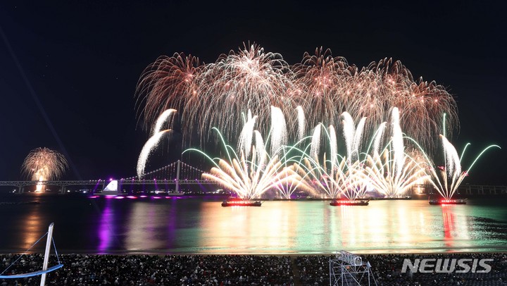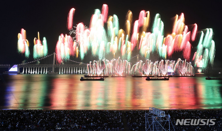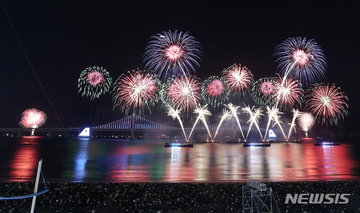 「第17回釜山花火祭り」が開かれた17日、釜山市水営区の広安里海水浴場一帯で華麗な花火ショーが繰り広げられている様子。今回の花火祭りは、新型コロナ問題の長期化で疲れている市民を慰労するため、3年ぶりに正常開催された。