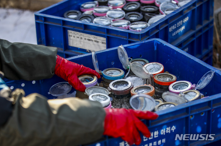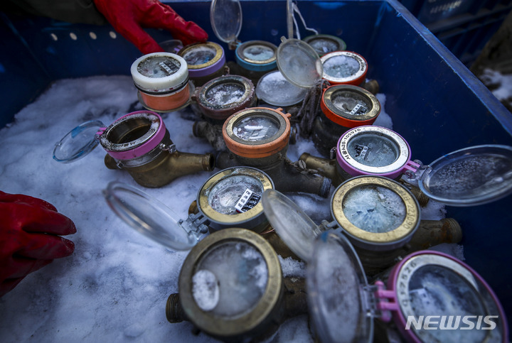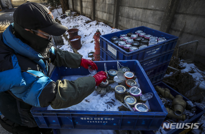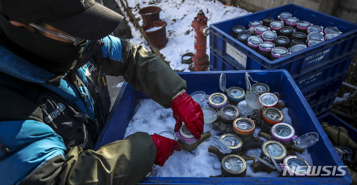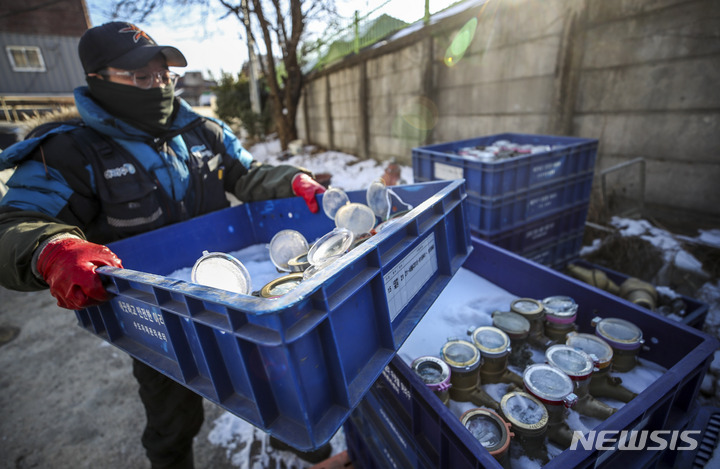 【NEWSIS】18日午前、ソウル市鍾路区の中部水道事業所孝子加圧場で、凍結により破損した水道メーターを整理する職員。ソウル市ではこの冬に入って初めて水道計器の凍結破損に対する「警戒」を発令した。凍結破損の「警戒」とは、「関心」「注意」「警戒」「深刻」という4段階の水道計量器凍結破損予報のうちの第3段階で、一日の最低気温が氷点下10℃未満の天気が二日以上続く時に発令される。