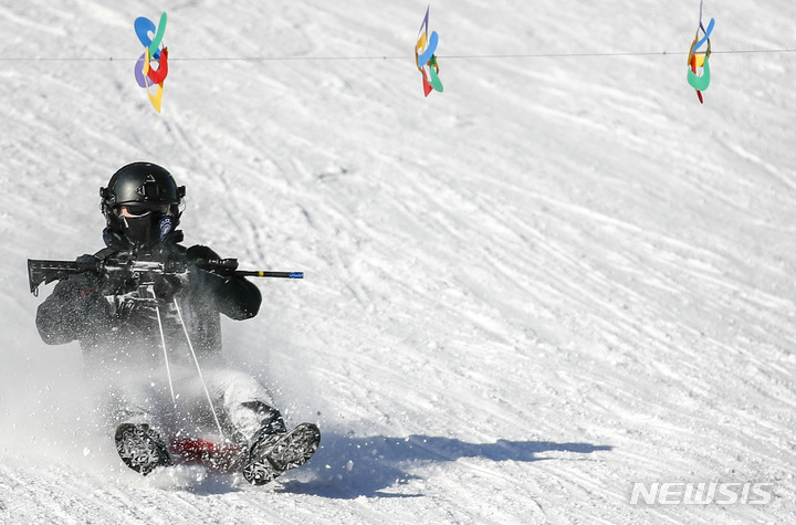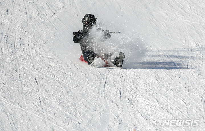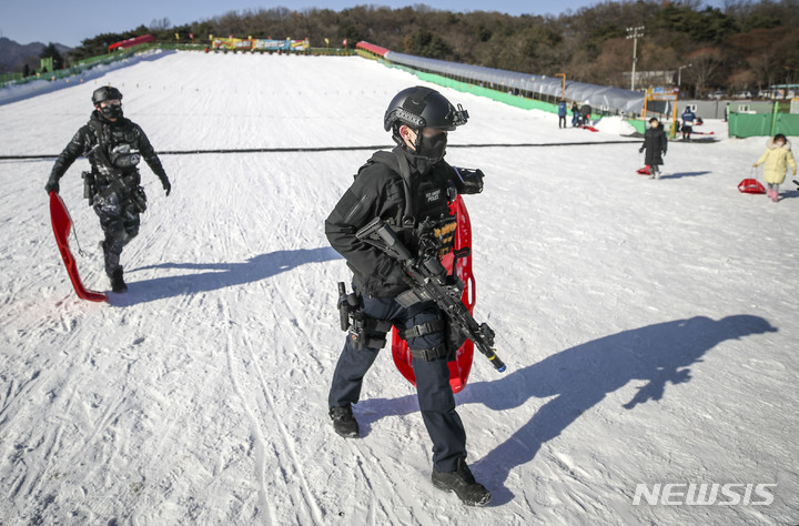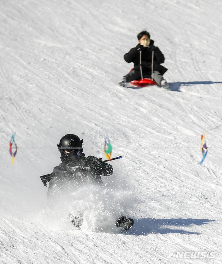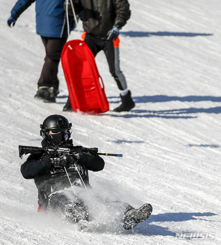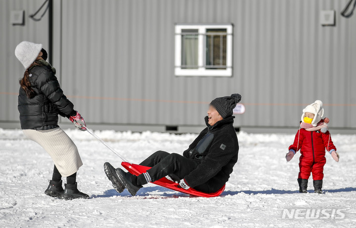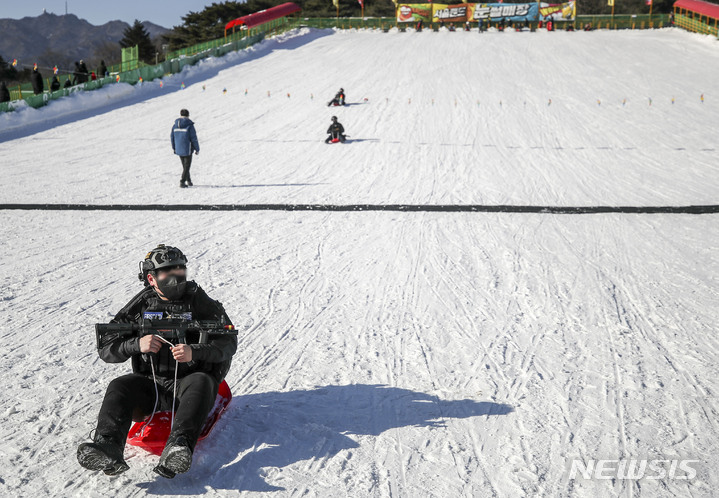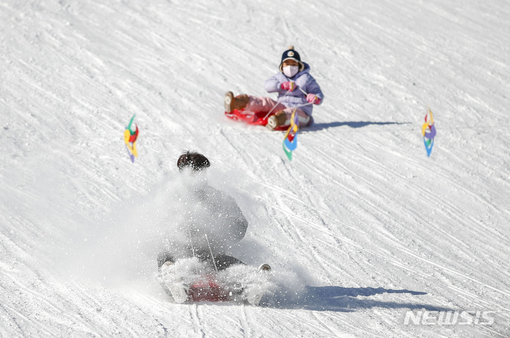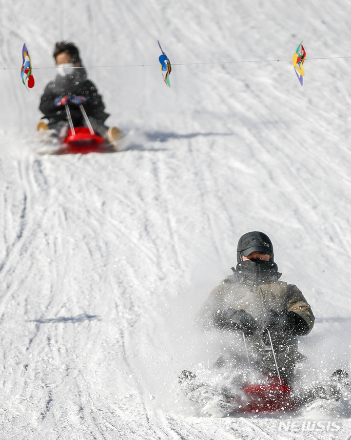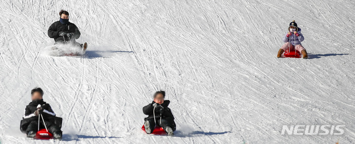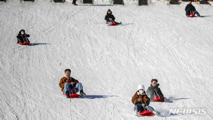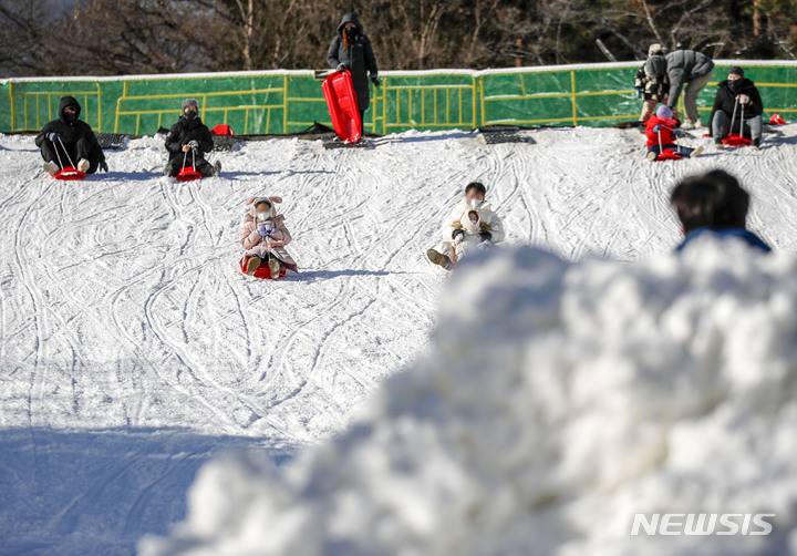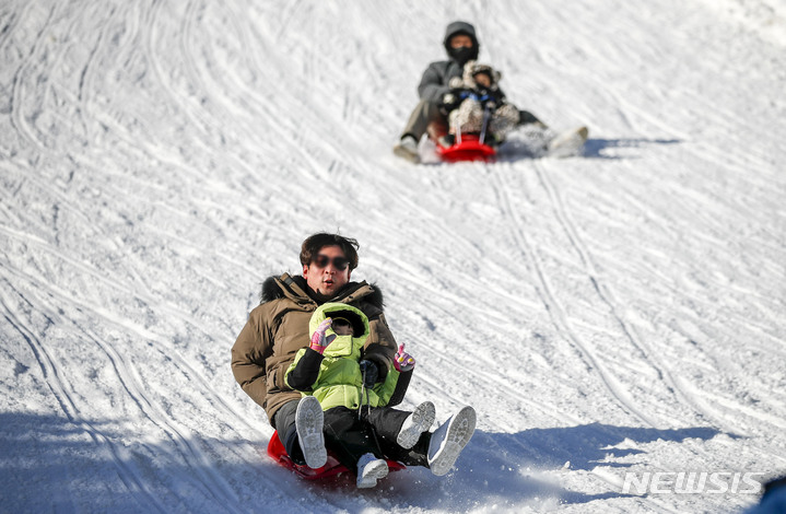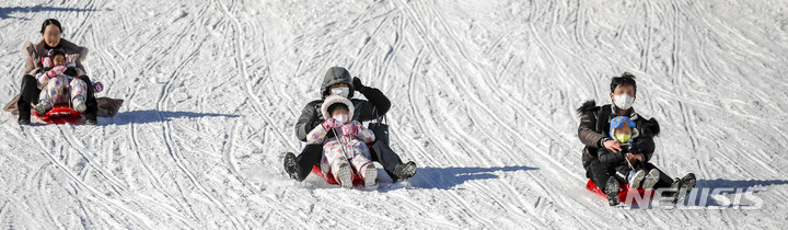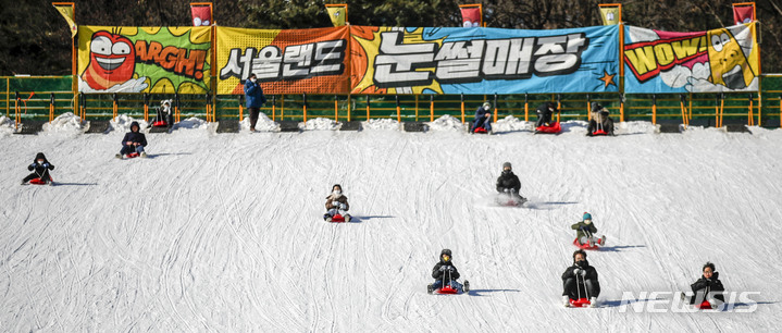 【NEWSIS】寒波が続く18日、京畿道果川市内のテーマパーク「ソウルランド」で雪ぞりを楽しむ人々。