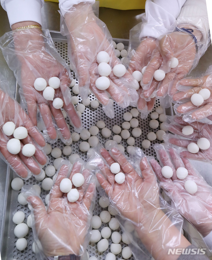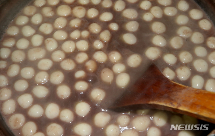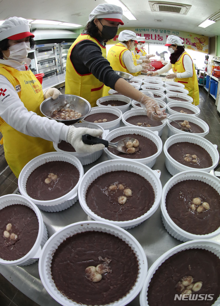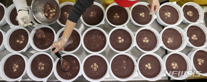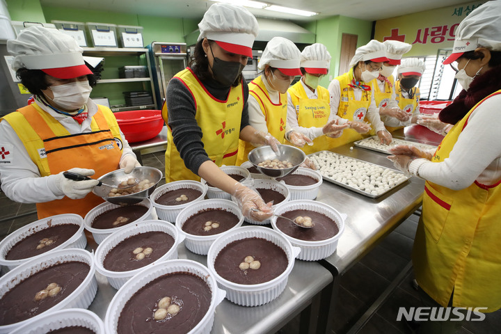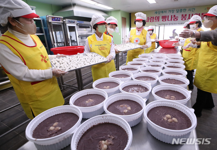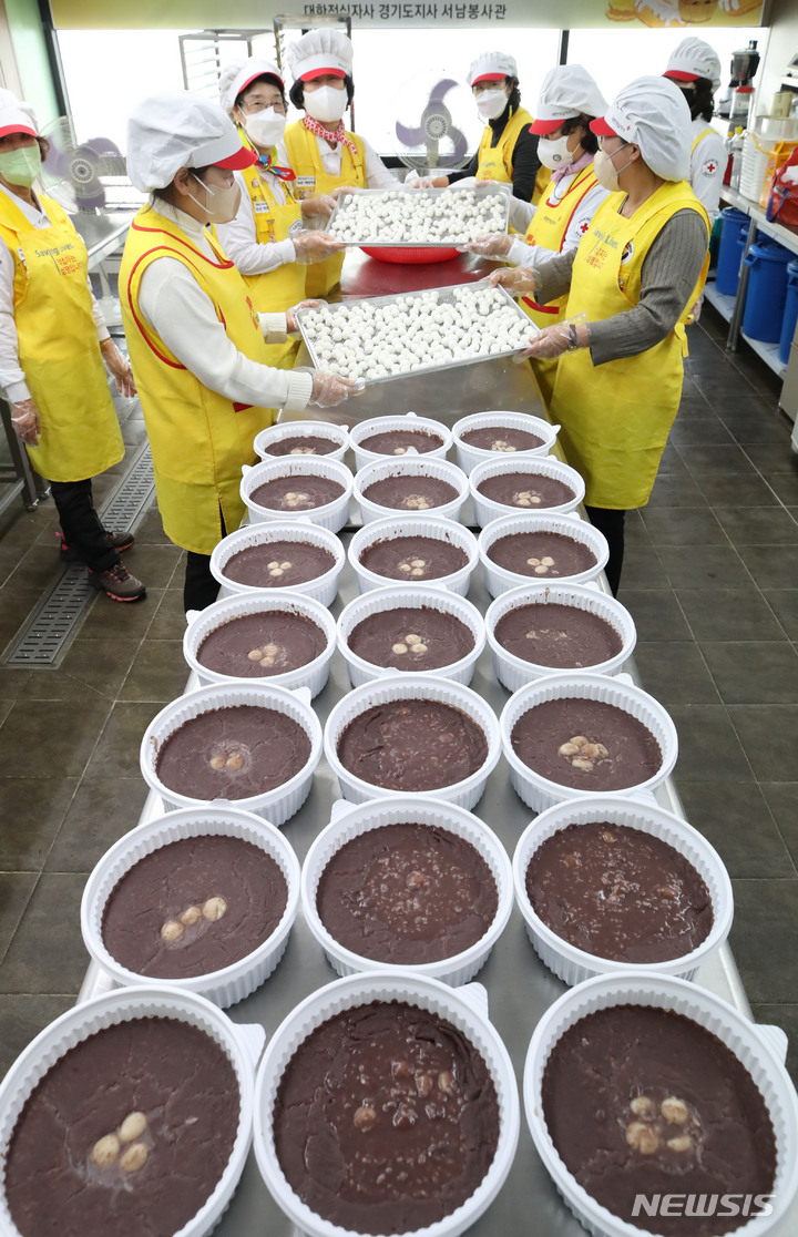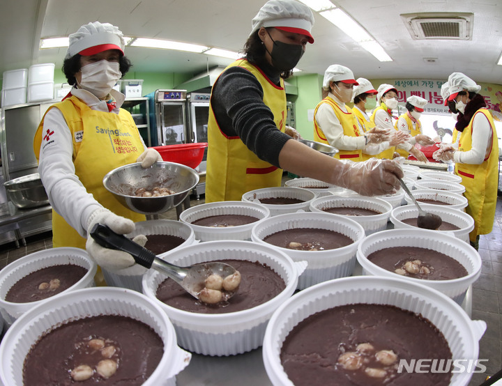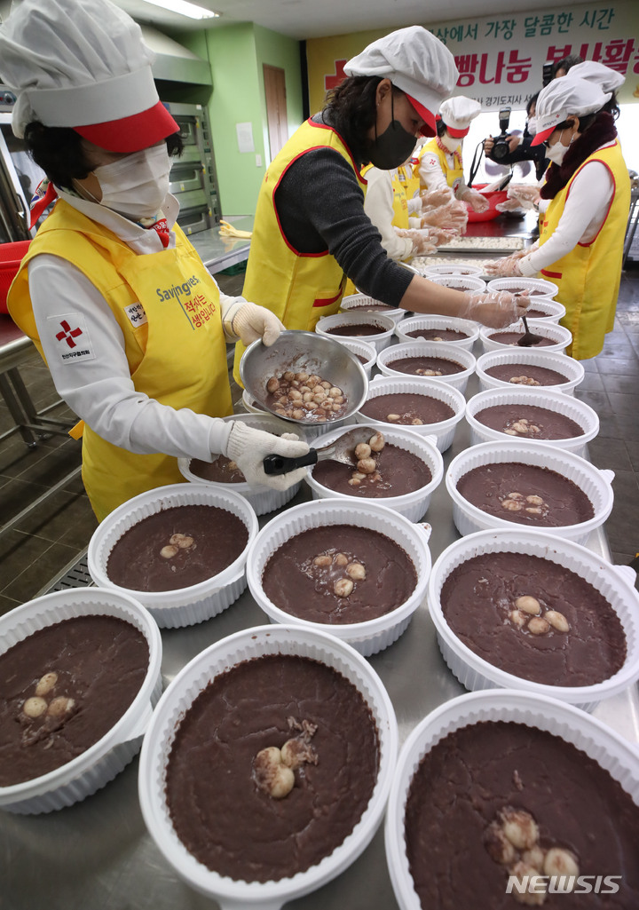 京畿道安山市壇園区古棧洞の大韓赤十字社京畿道支社西南奉仕館で20日午前、安山メアリ奉仕会のボランティアが、祖父母が孫を育てている家庭や高齢者夫婦、一人親の家庭など、赤十字希望風車結縁世帯に届ける冬至の小豆粥を作っているところ。