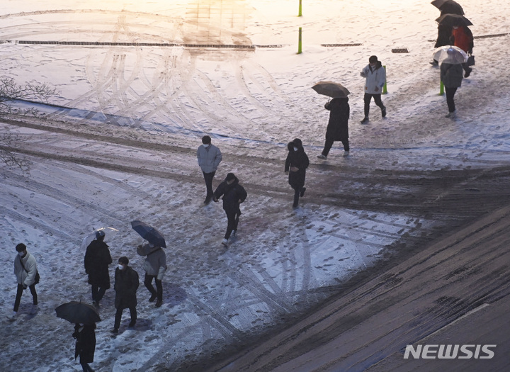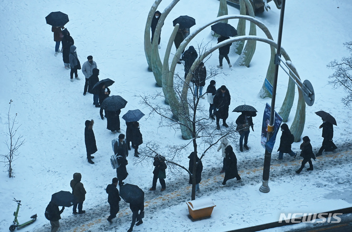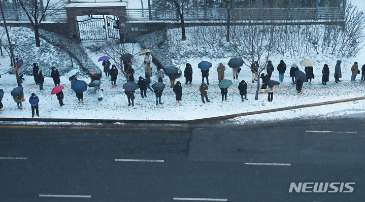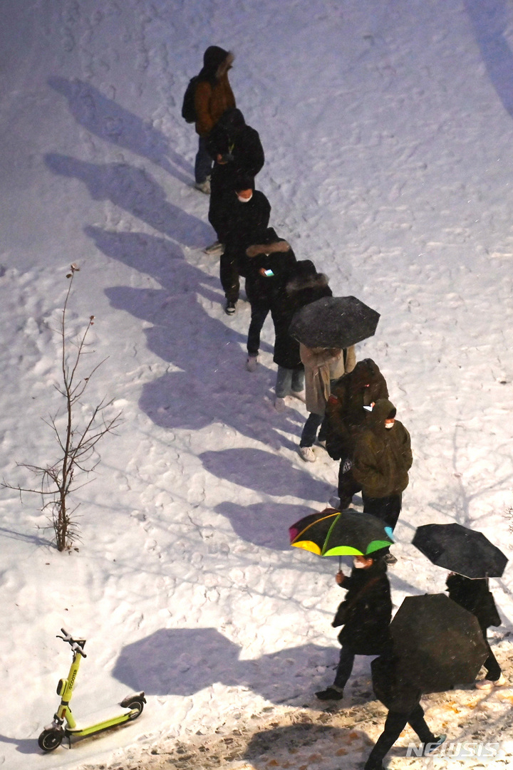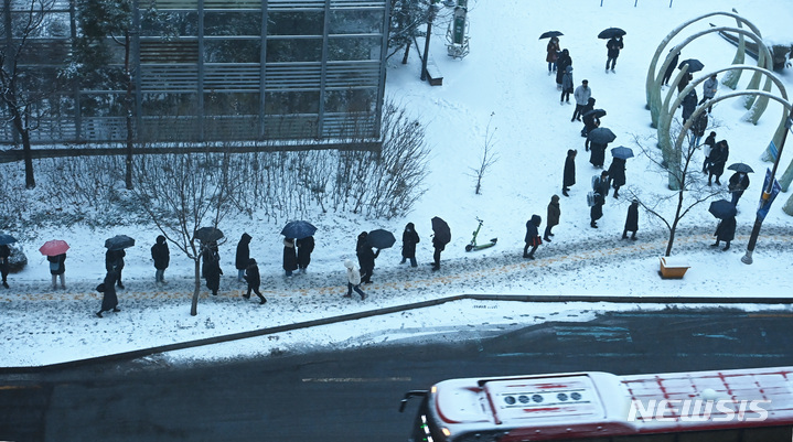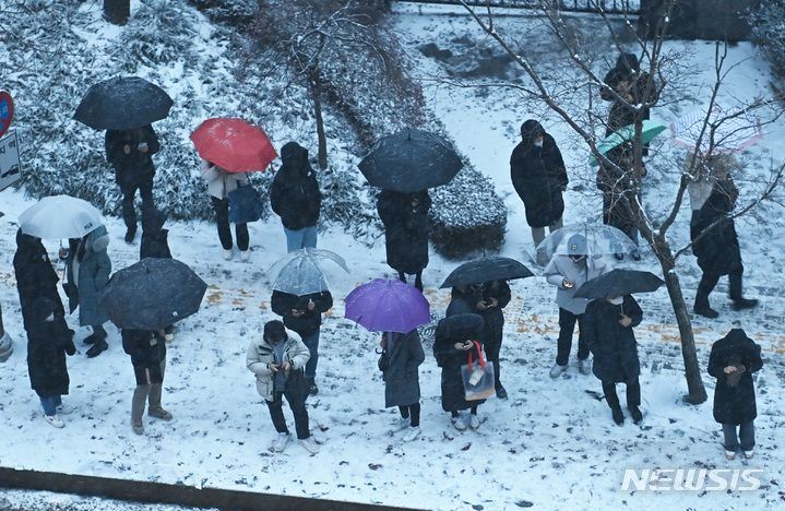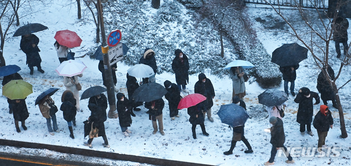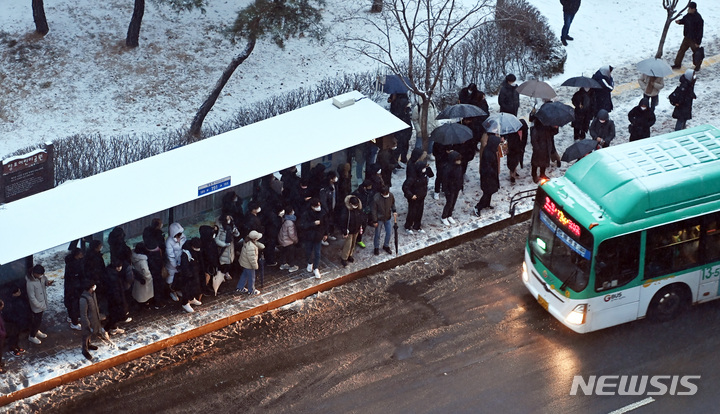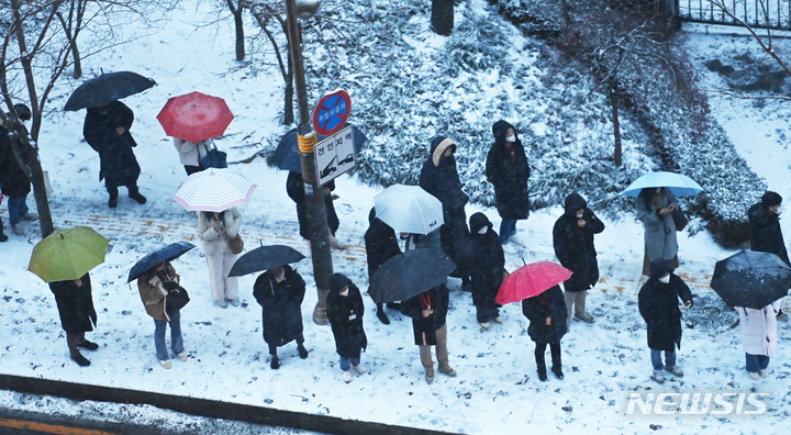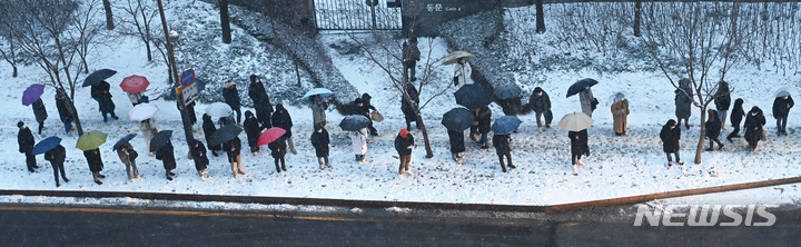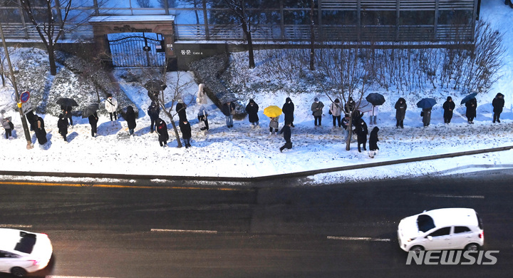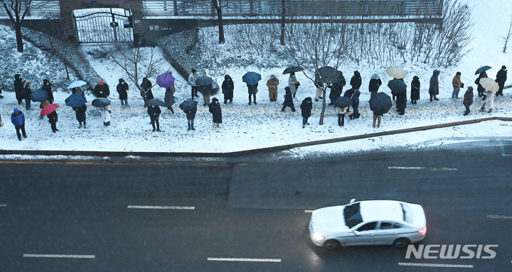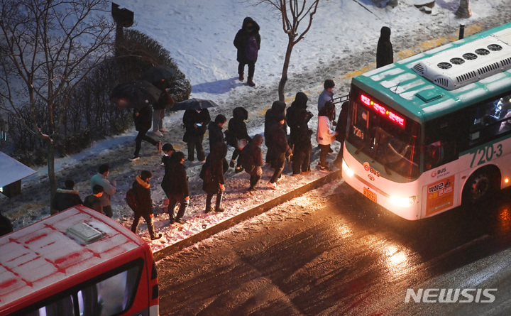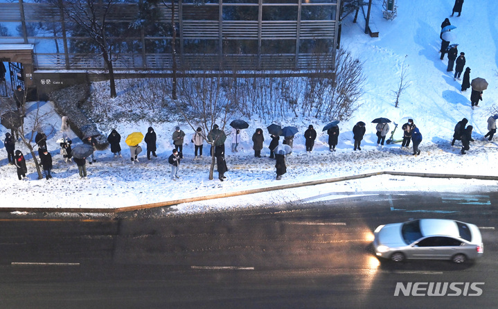 【NEWSIS】首都圏に大雪注意報が発令された21日午前、京畿道水原市霊通区の網浦駅近くにあるバス停で、出勤のためバスを待つ人々。