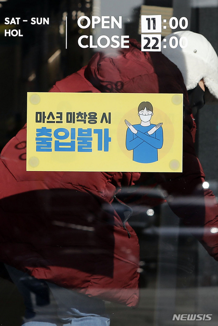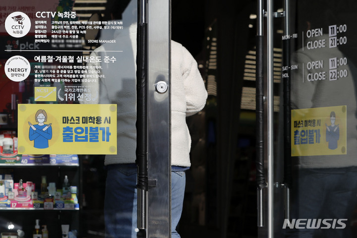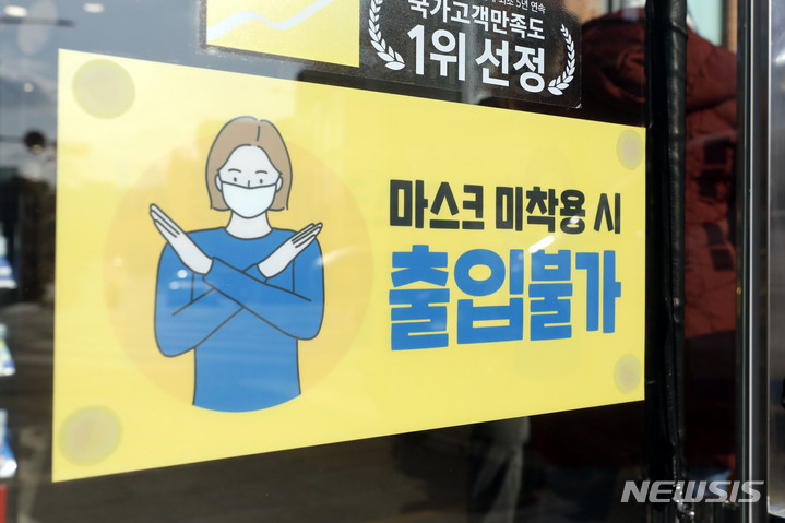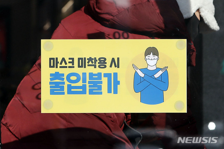 政府が屋内でのマスク着用義務化調整計画を発表した23日、ソウル市竜山区内の店舗には、入店時のマスク着用に関する案内文が掲示されていた。政府は、屋内でのマスク着用について、義務から勧告に切り替える基本方向を設定したが、流行状況や危険度などを考慮し、2段階に分けて調整していくことにした。