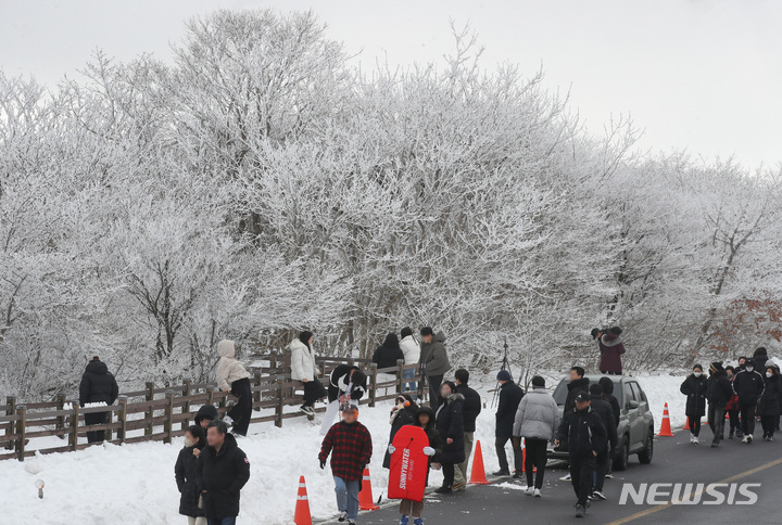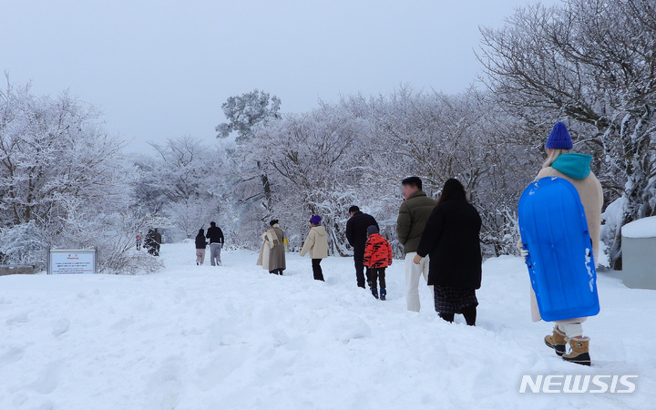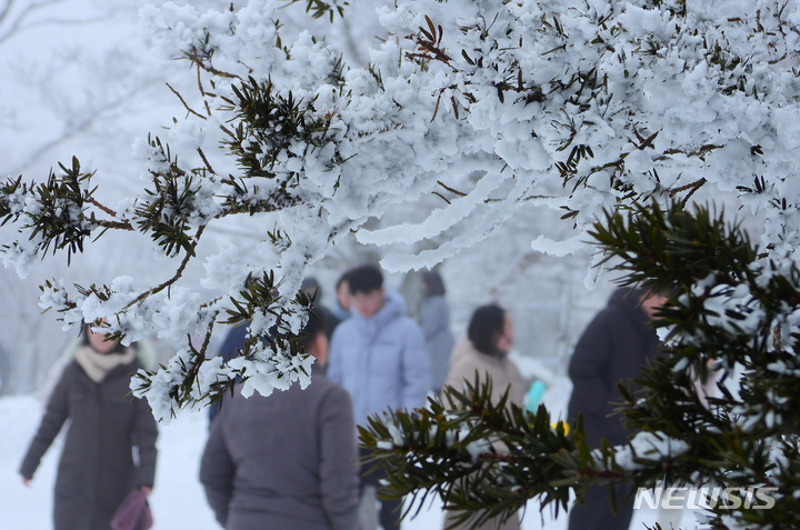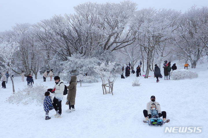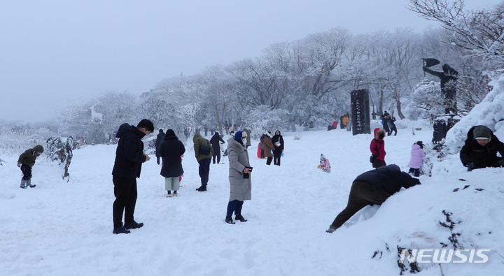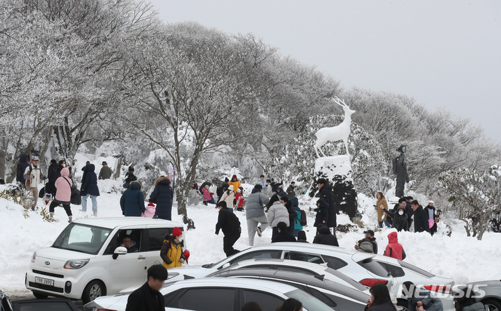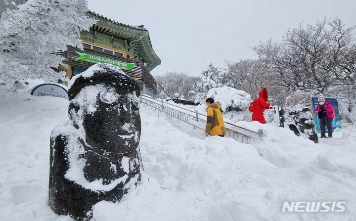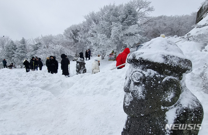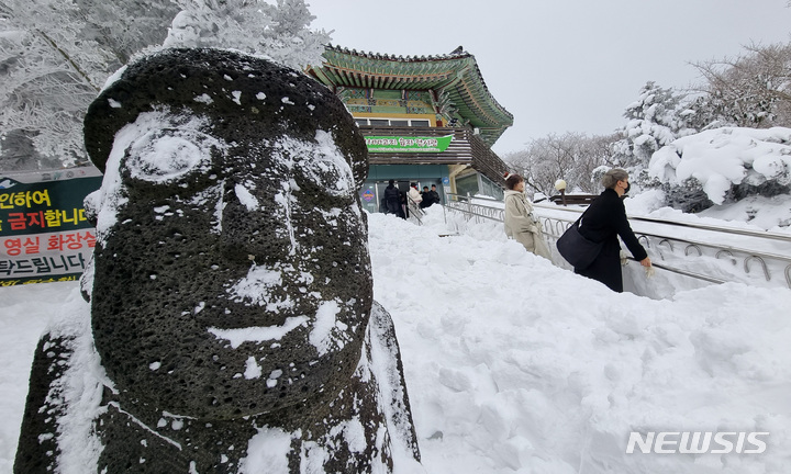 週末に降った大雪の影響で26日、済州・漢拏山の1100高地に立つトルハルバンは雪に埋もれていた。韓国気象庁によると、クリスマス前の四日間で済州・漢拏山の賜祭碑には92.4センチを超える雪が降った。