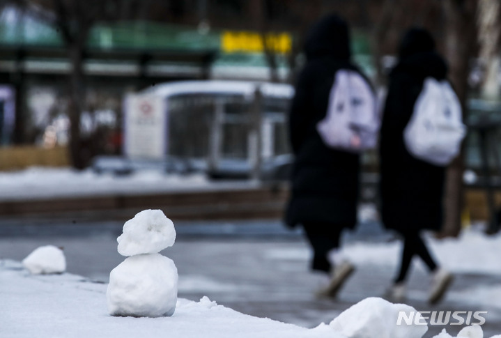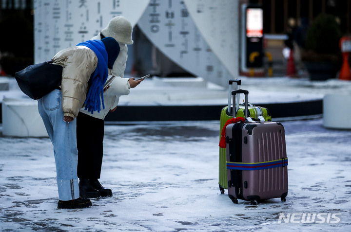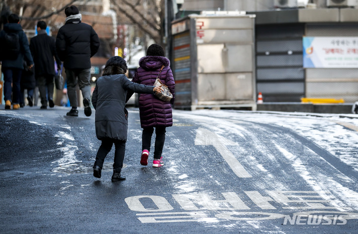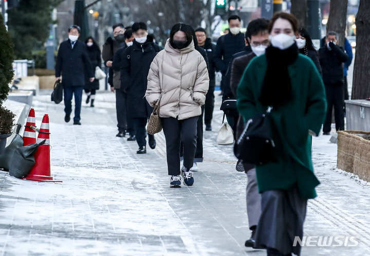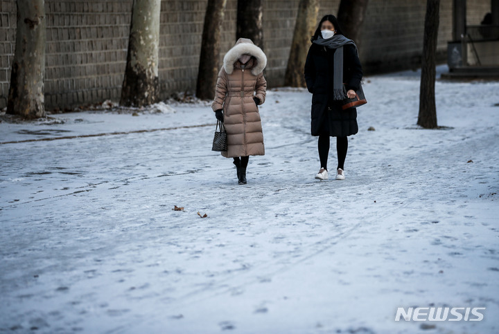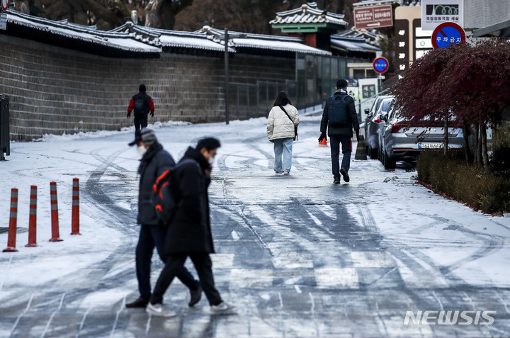 【NEWSIS】厳しい寒さが続いている28日午前、ソウル市鍾路区の世宗大路で、雪が降り凍結した坂道を上る人々。