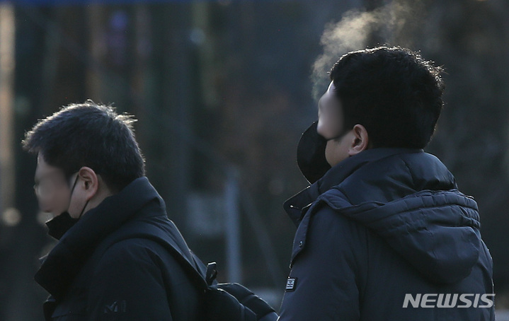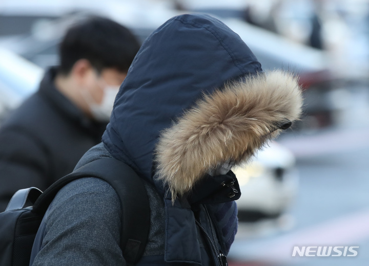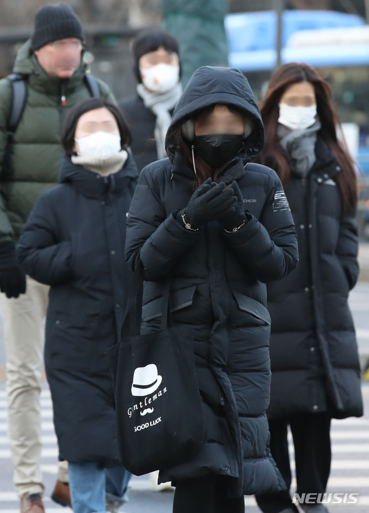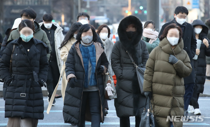 【NEWSIS】29日午前、ソウル・光化門交差点で、最低気温が氷点下8℃という厳しい寒さの中、厚手の防寒着を着て出勤する人々。