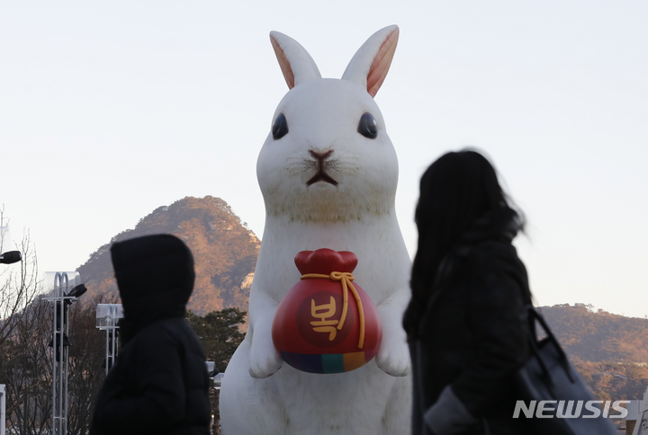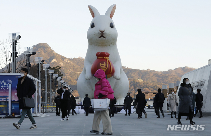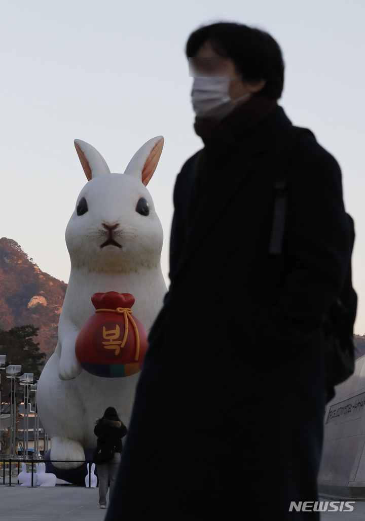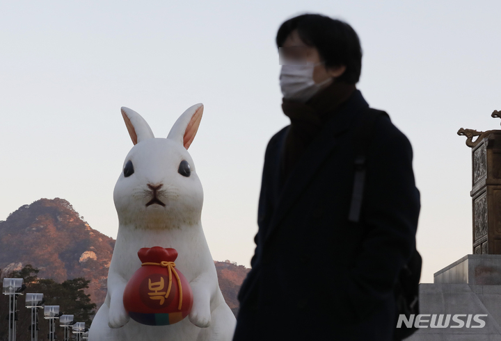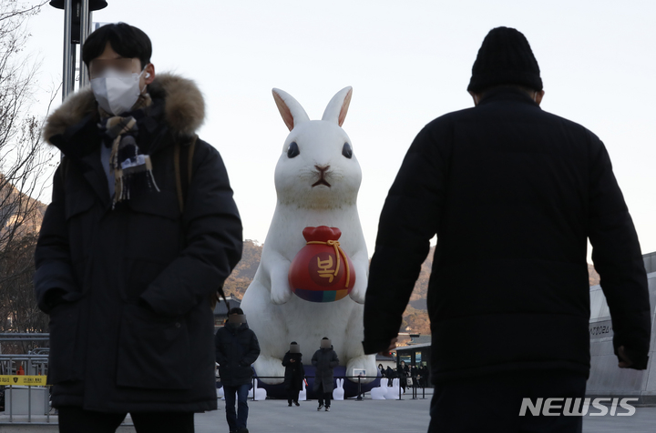卯年に当たる2023年初日からソウルで朝の気温がマイナス6度を記録するなど、寒い一日となった2日、ソウル市内の光化門広場では、出勤するサラリーマンの姿が見られた。