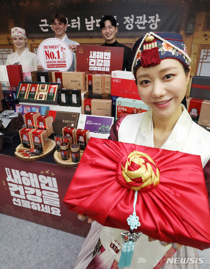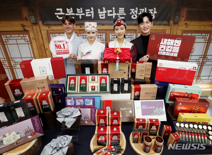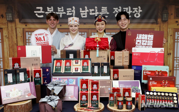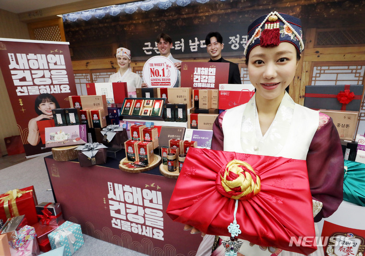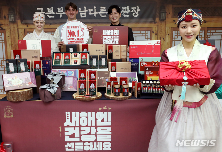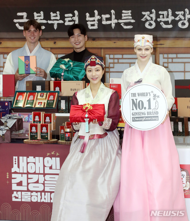 ソウル市中区にある飲食店「韓国の家(コリアハウス)」の聚仙館で2日、癸卯(みずのとう)年の新年に合わせてKGC人参公社の「新年には健康を贈りましょう」プロモーションイベントが行われ、コンパニオンがポーズを取っている様子。