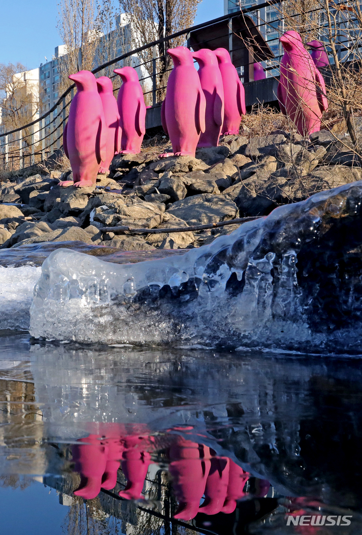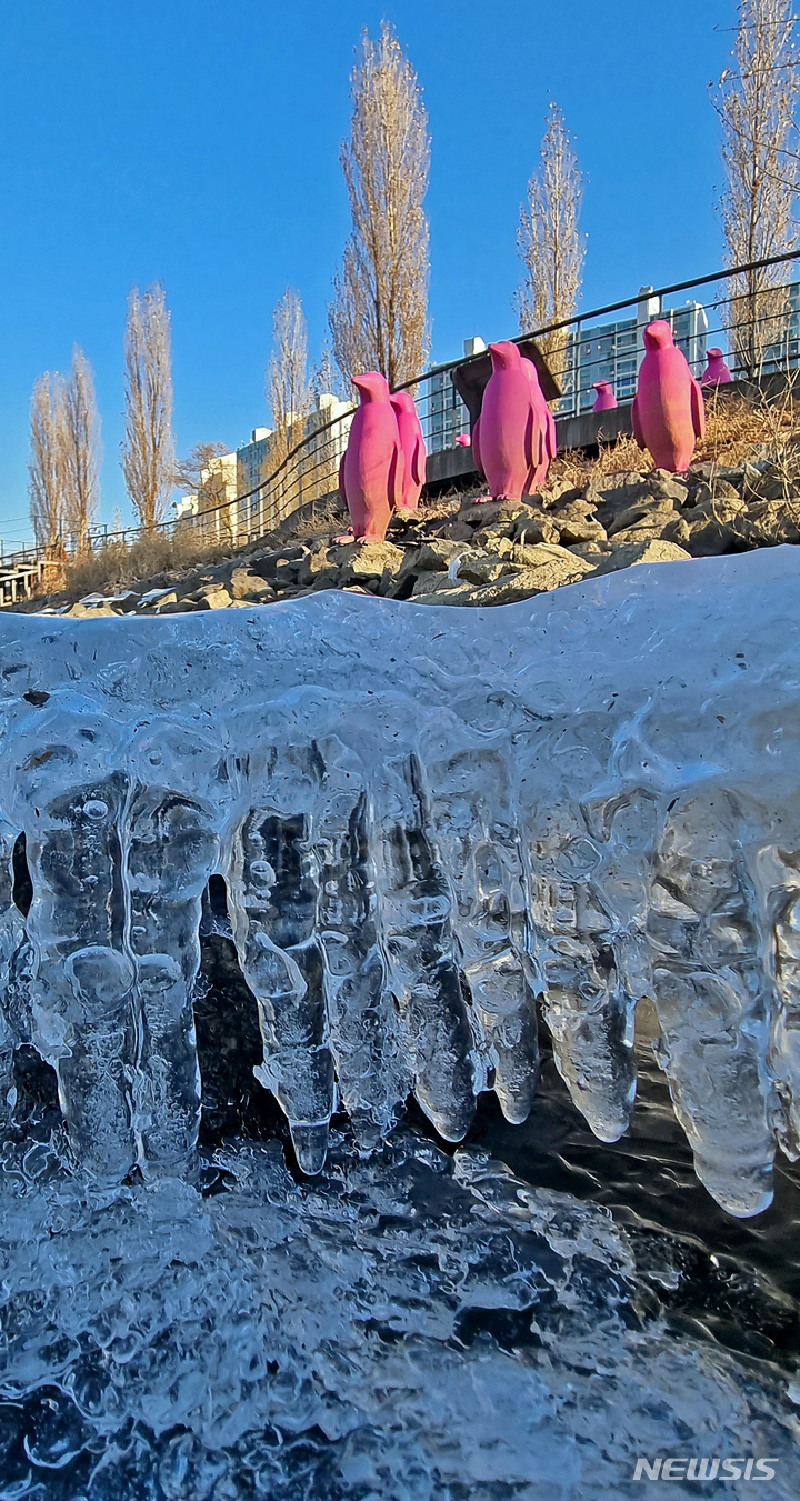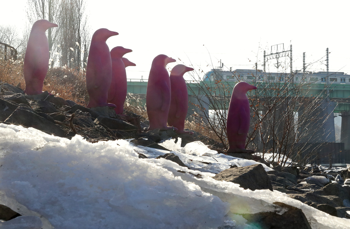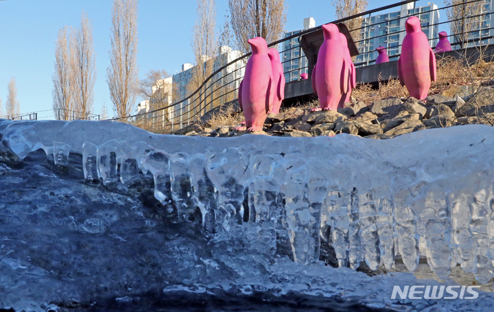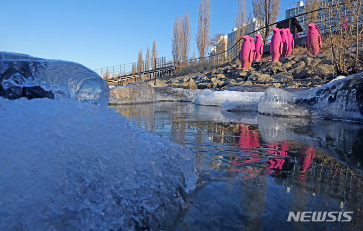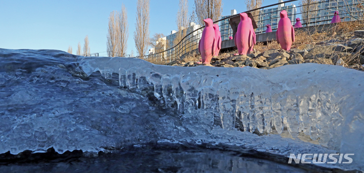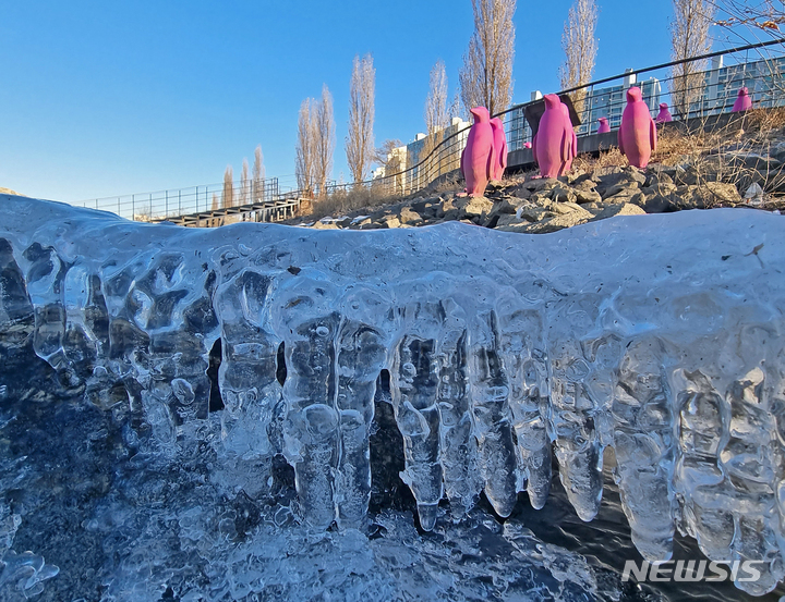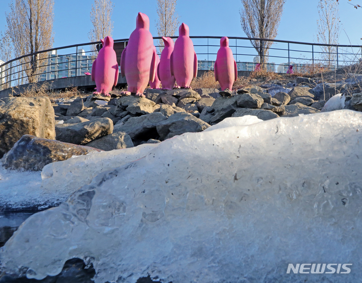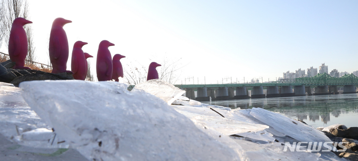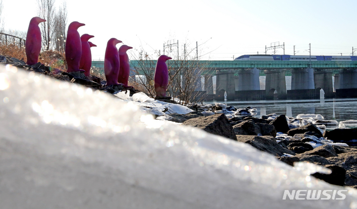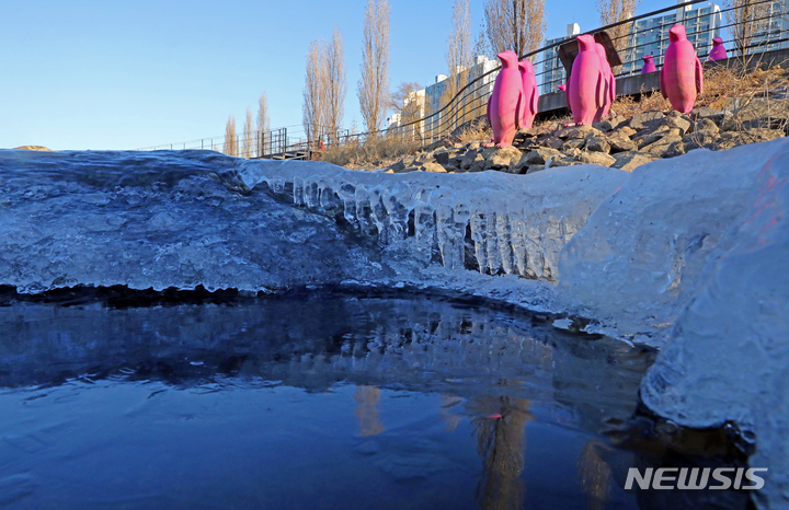 厳しい寒さが続く中、ソウル市竜山区の漢江公園では3日、川に氷が張っていた。