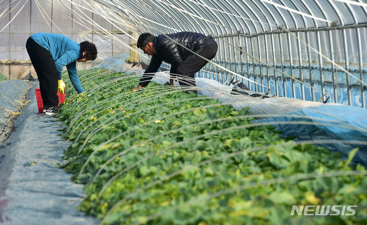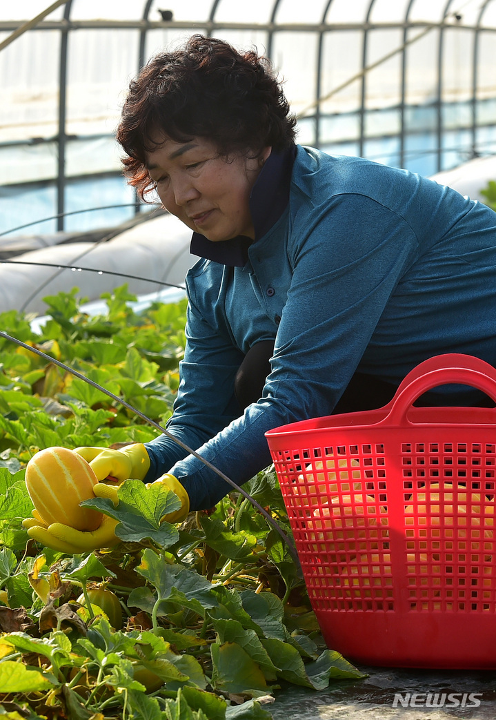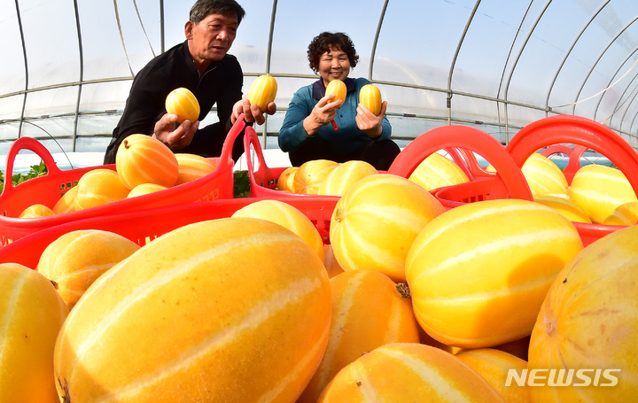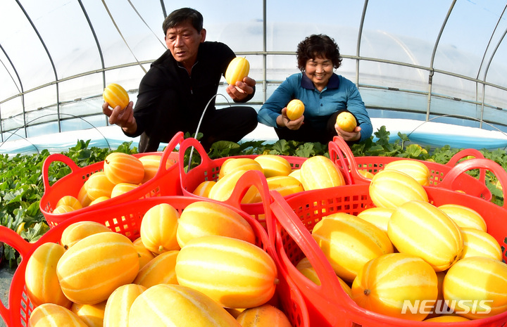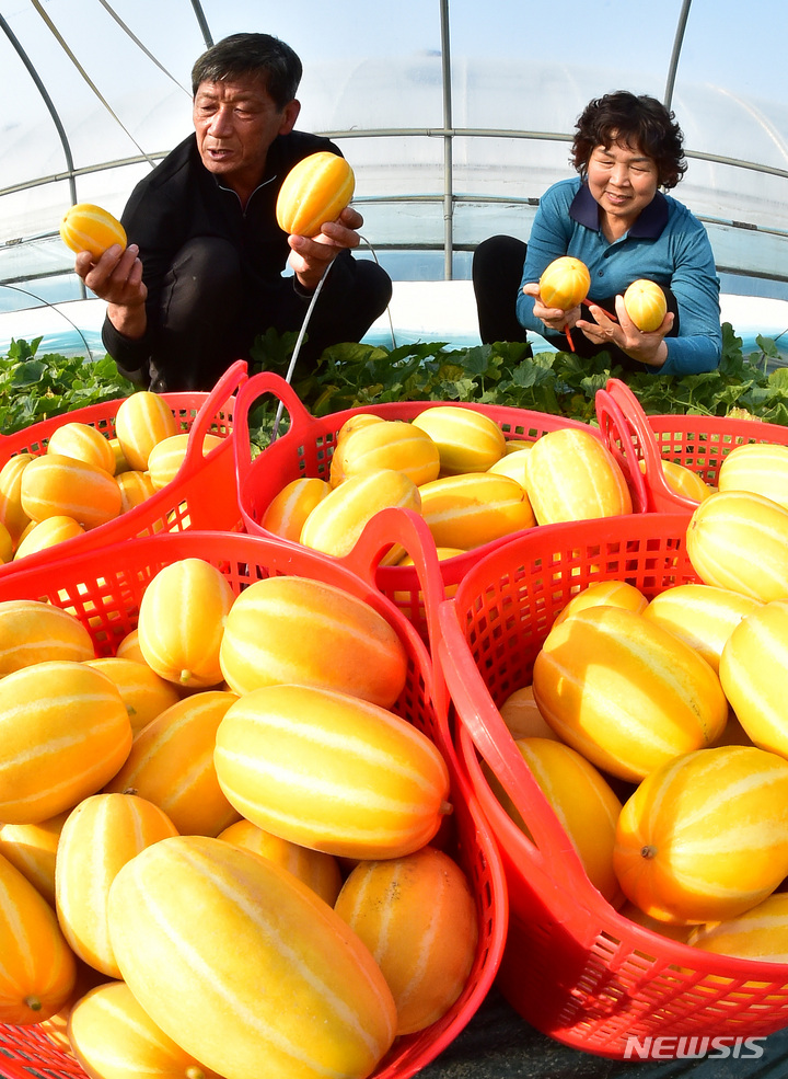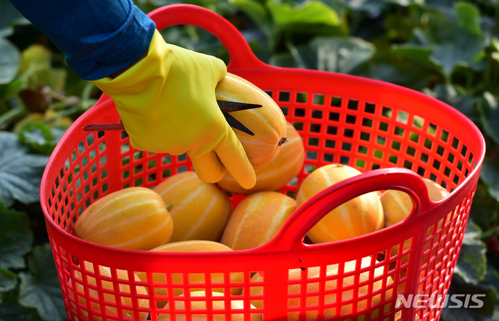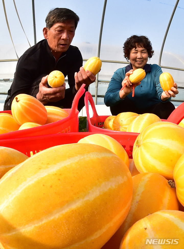 今年最初の星州マクワウリの出荷が行われた6日午前、慶尚北道星州郡月恒面長山里のマクワウリ栽培ハウスで、食べごろに実ったマクワウリを収穫している関係者の様子。