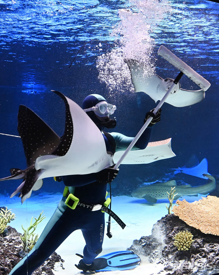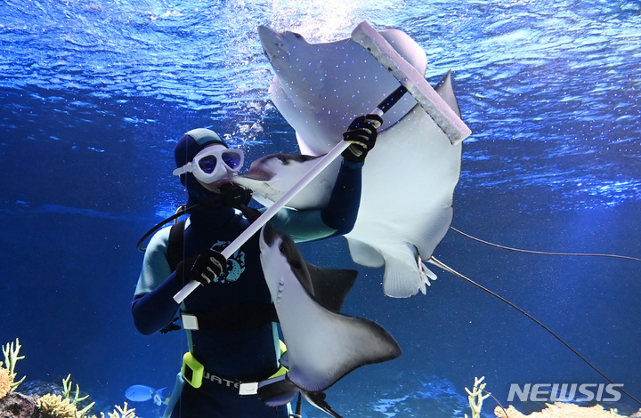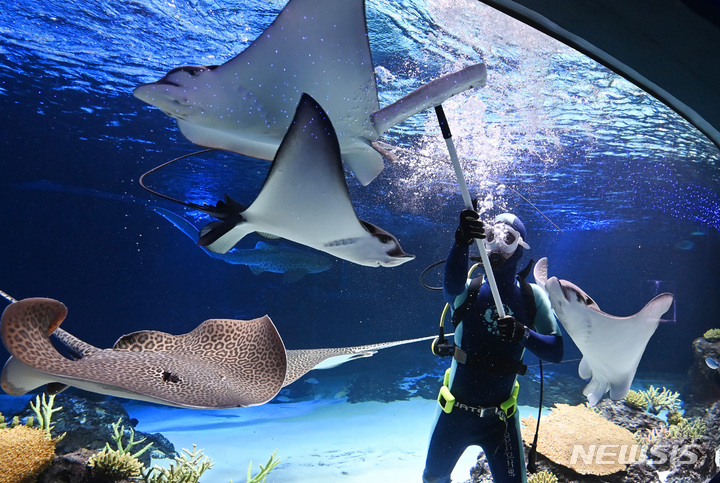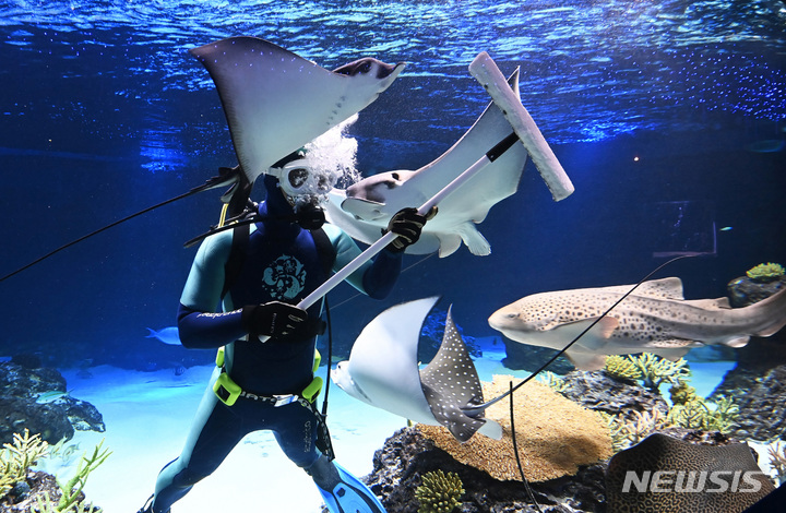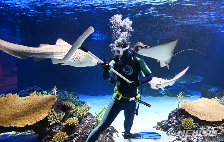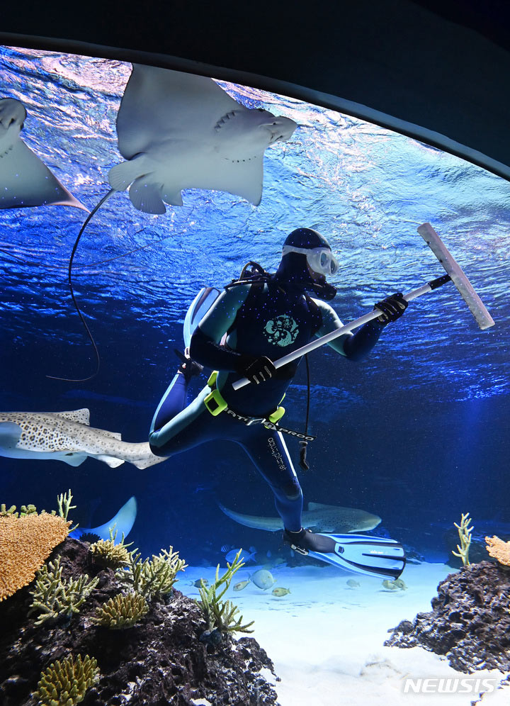京畿道水原市霊通区のアクアプラネット光教で9日午前、新年を迎えてダイバーが水槽の清掃をしている様子。
