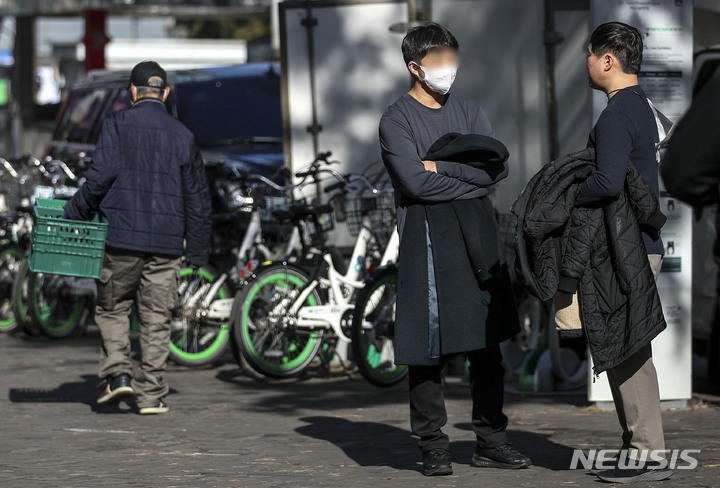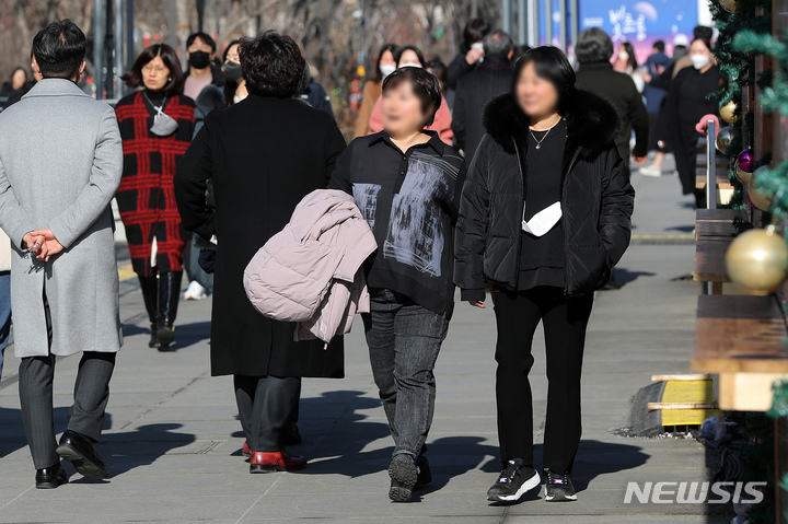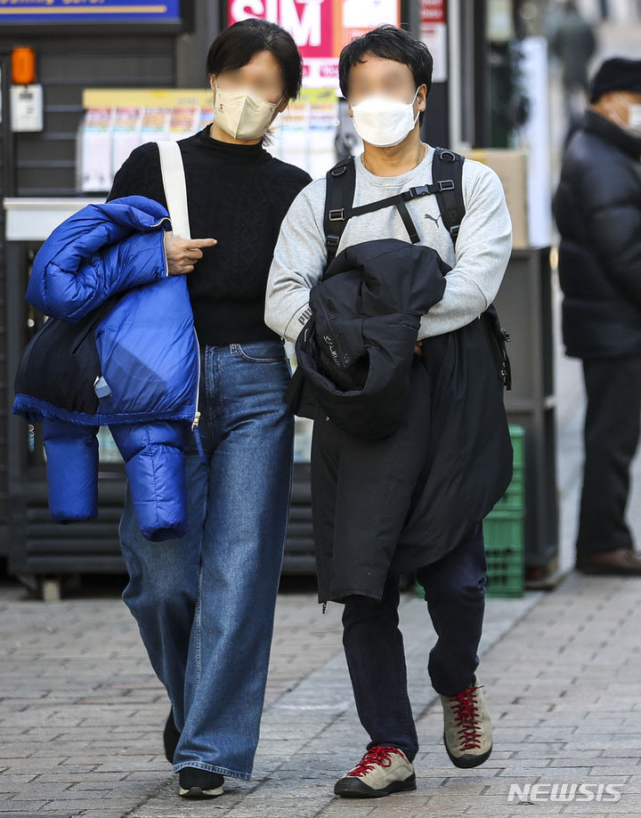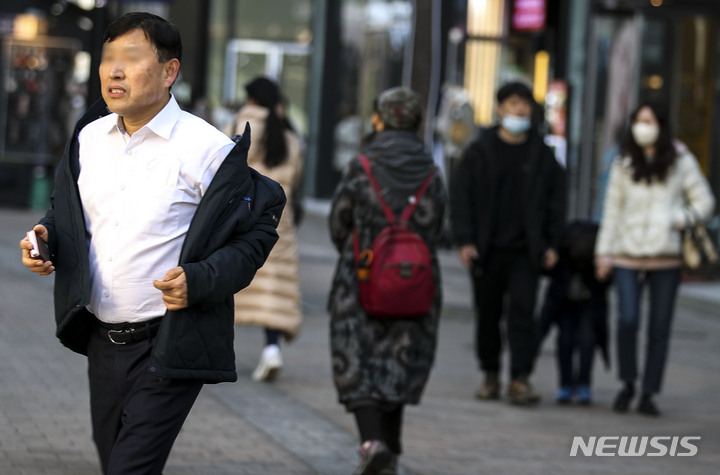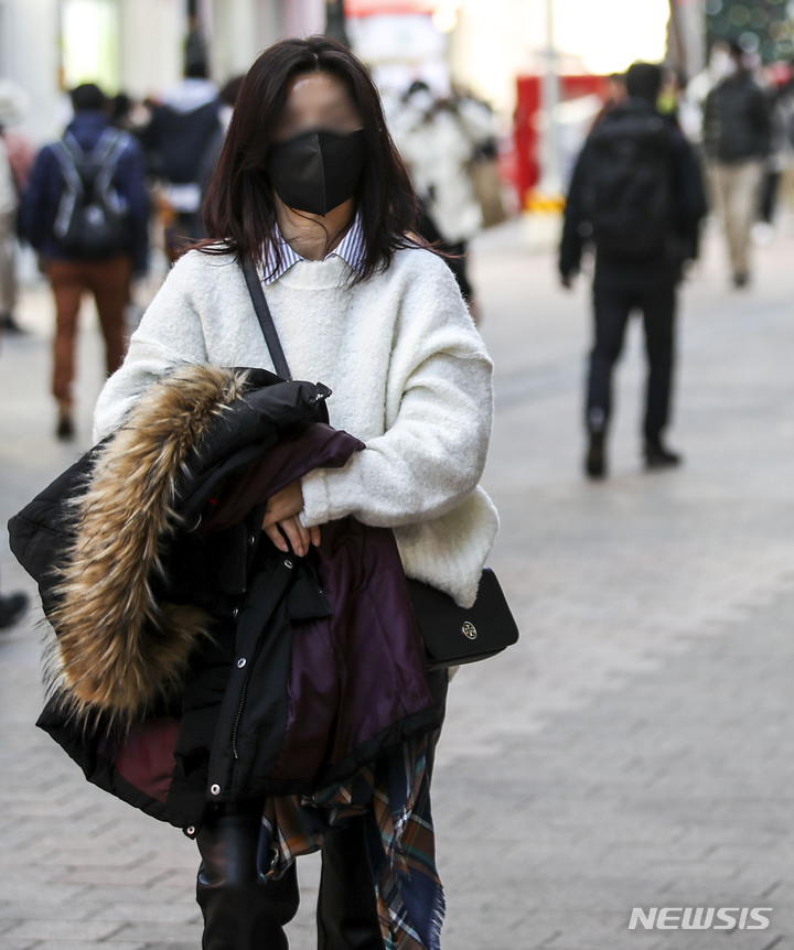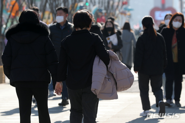 ソウルの昼間の気温が7度まで上がり、比較的暖かな天気となった10日午後、ソウル市中区明洞では防寒着を脱いだ市民が行き交っていた。