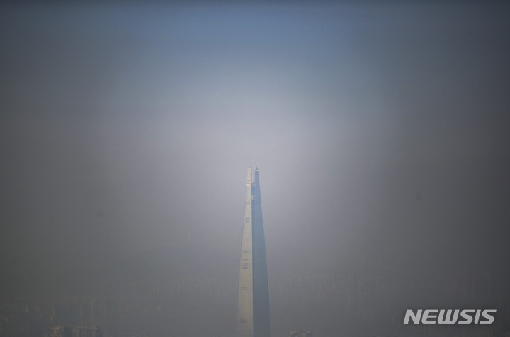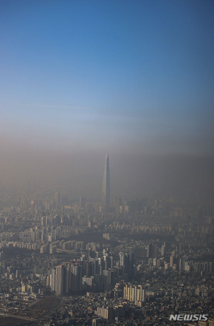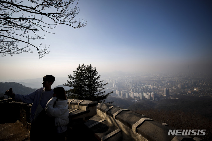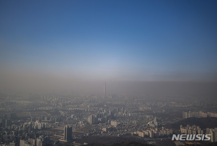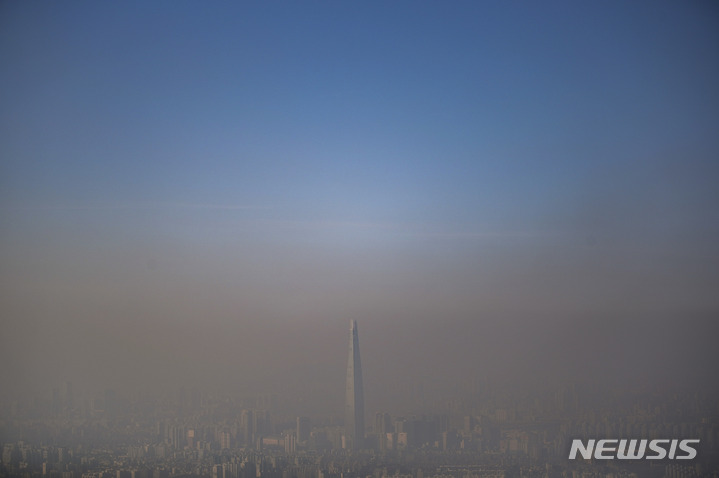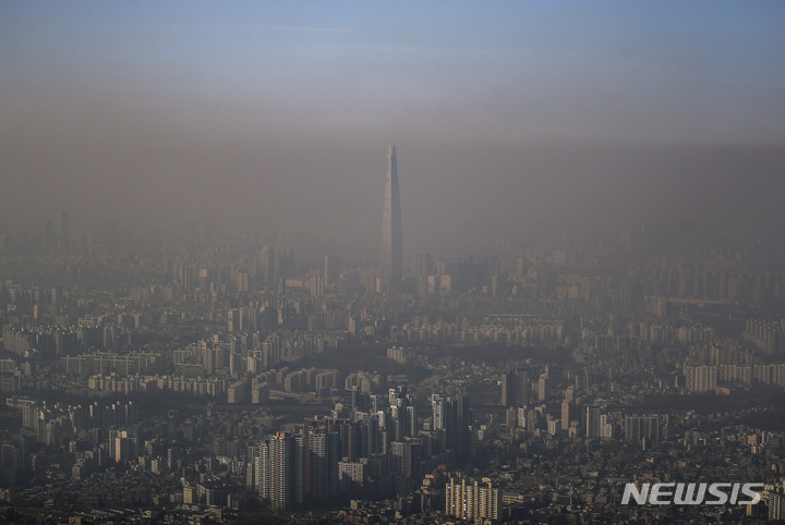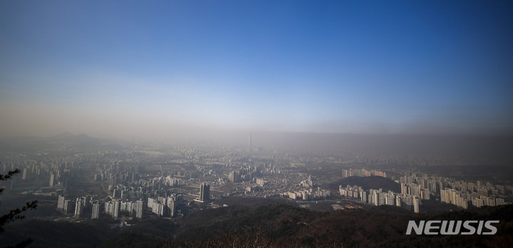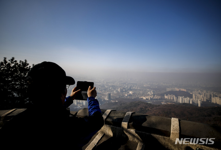 11日午後、京畿道広州市の南漢山城から望むソウル都心は、PM2.5で白くかすんでいた。