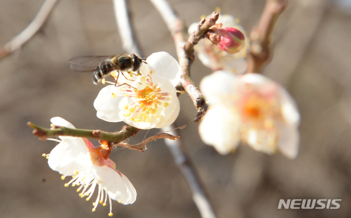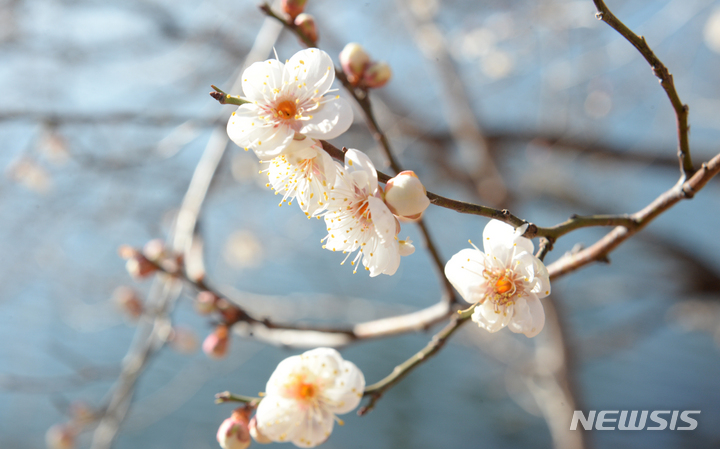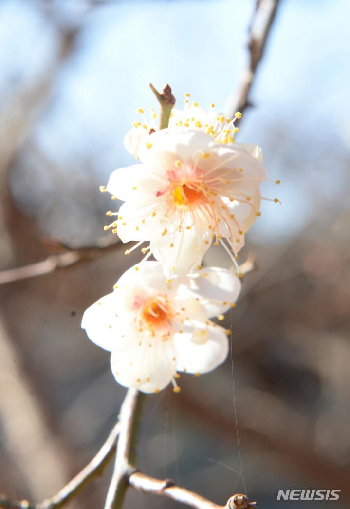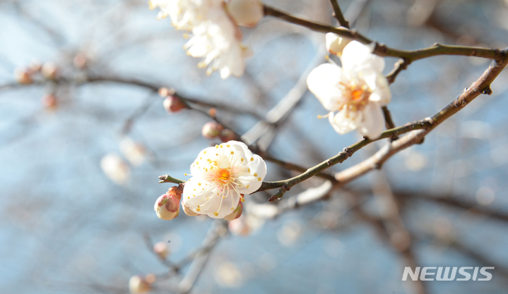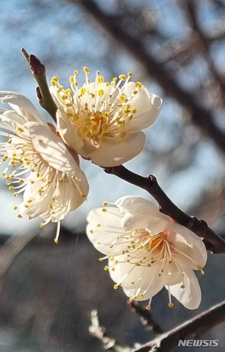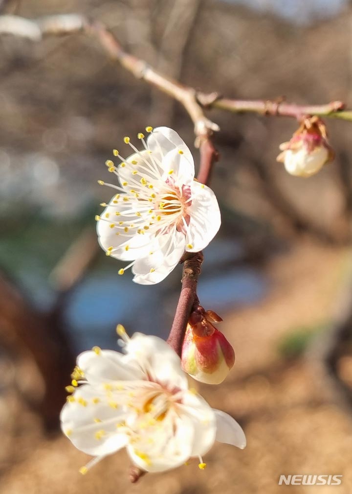 温かい天気となった11日午前、蔚山市南区の仙岩湖水公園一帯ではウメの花が咲いていた。