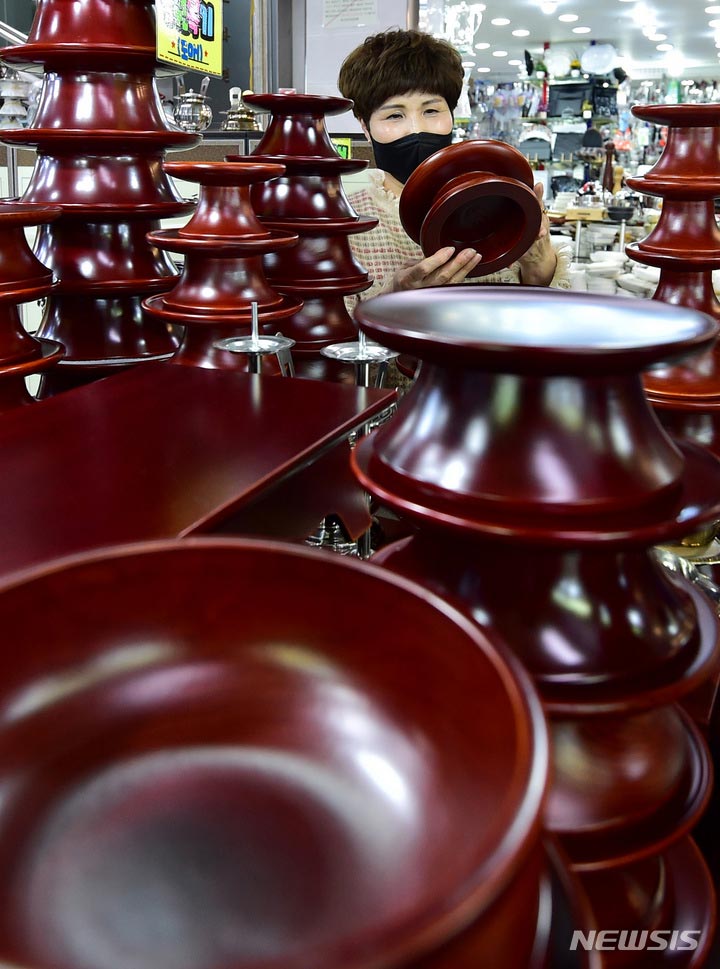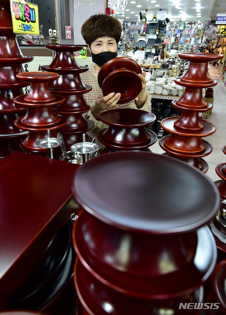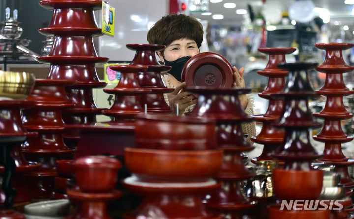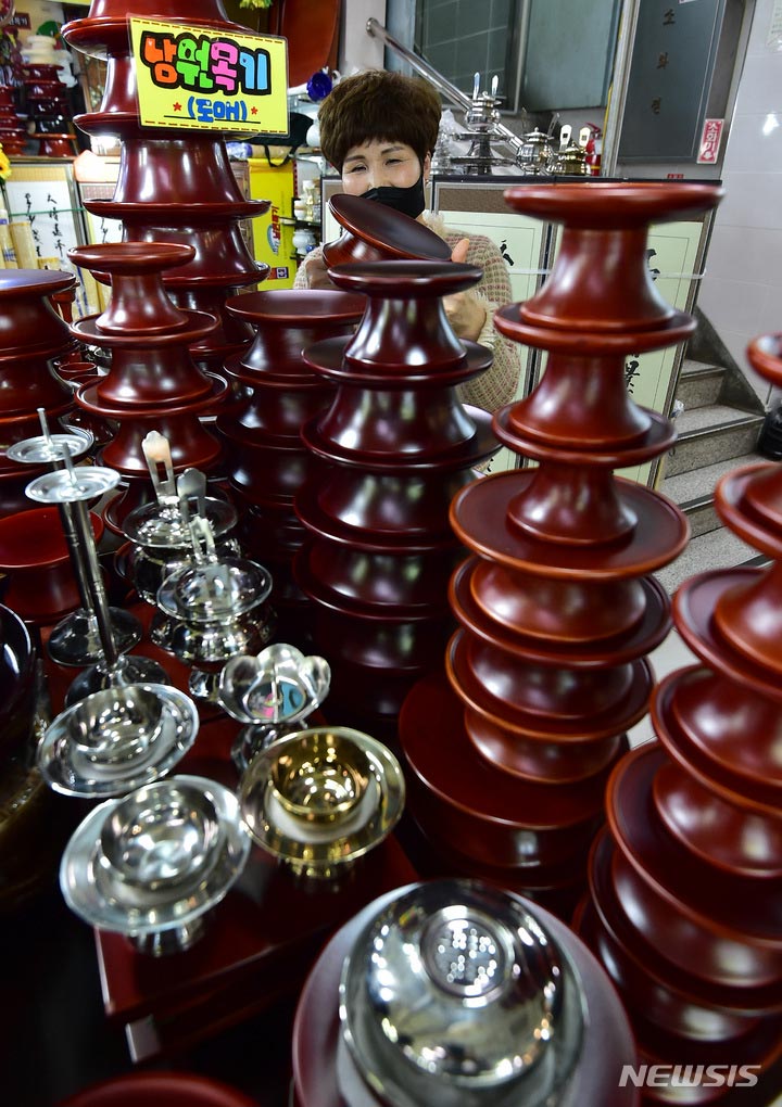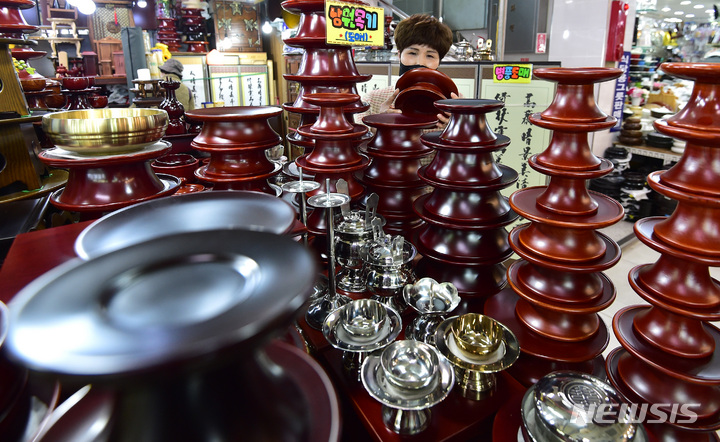 【NEWSIS】旧正月(今年は1月22日)が近づいた11日午後、大邱市中区の西門市場で、先祖にお供えするための器のセットを見る買い物客。