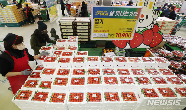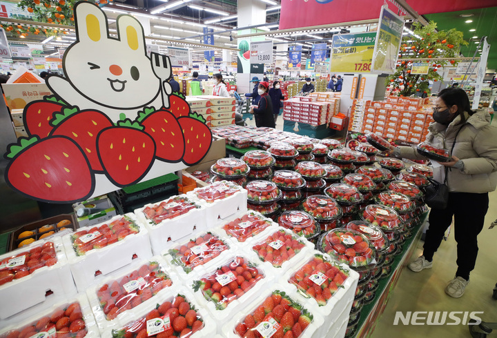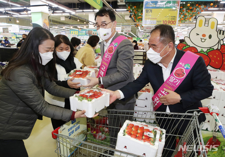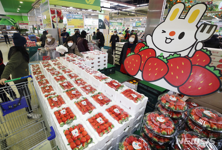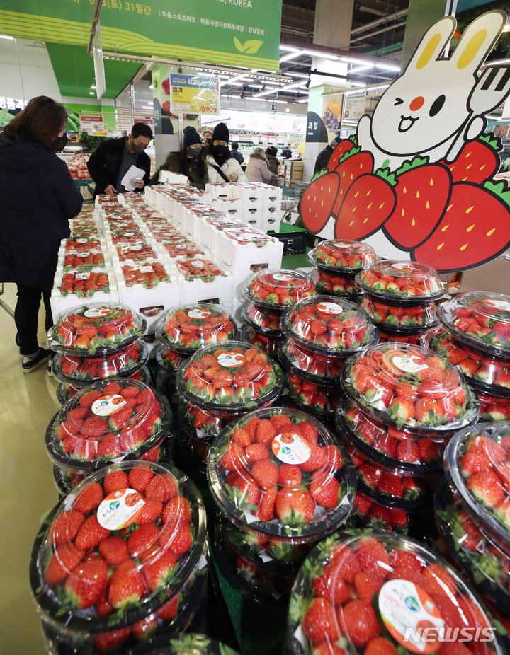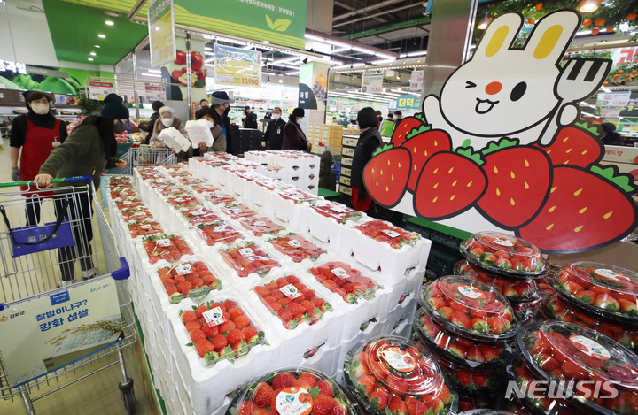 ソウル市瑞草区の大手スーパー「農協ハナロマート良才店」で12日、慶尚南道河東から出荷された「河東品愛イチゴ」を購入する消費者の様子。今回披露された「河東品愛イチゴ」は、慶尚南道河東で栽培され、GAP(Good Agricultural Practices. 農業生産工程管理)認証を受けた「雪香」品種のイチゴだ。