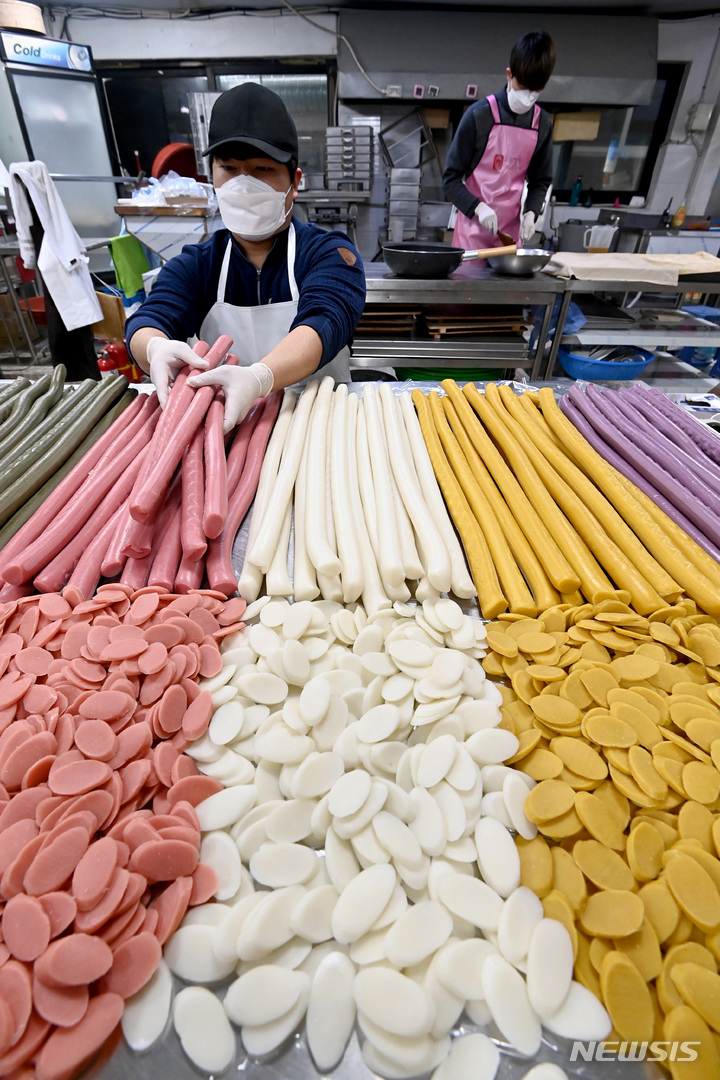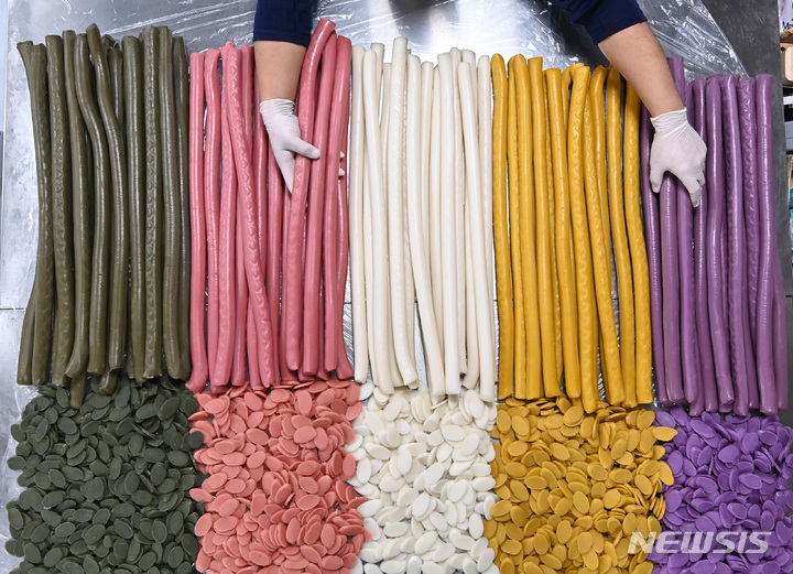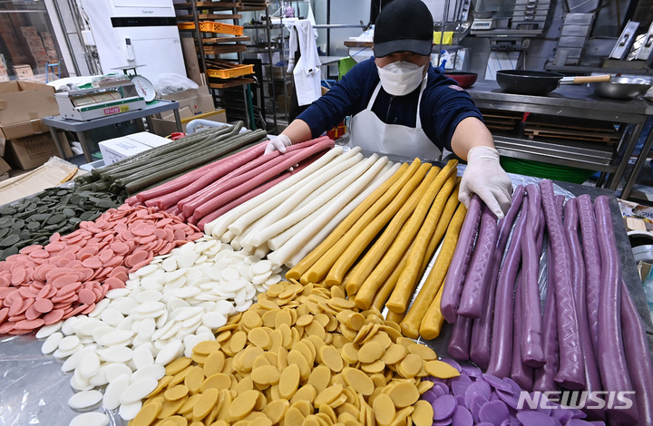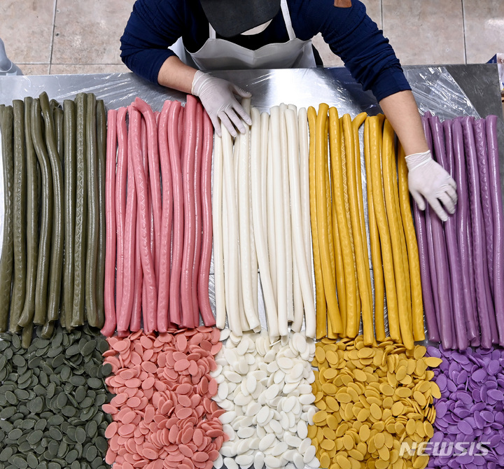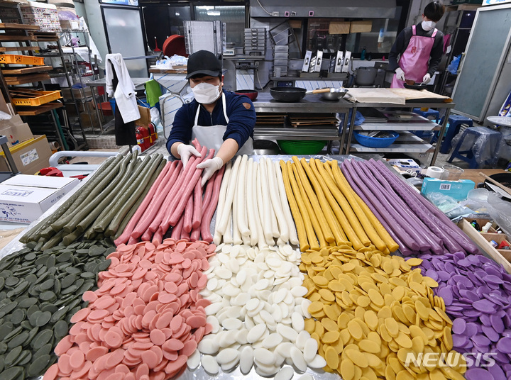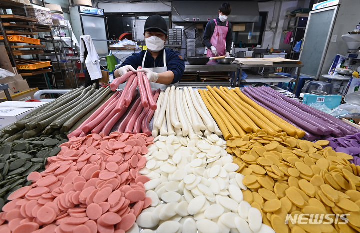 旧正月(今年は1月22日)を控えた13日、京畿道水原市長安区の亭子市場内にある餅店で、従業員らが五色のカレトック(細長い棒状の餅)をつくって包装準備をしていた。