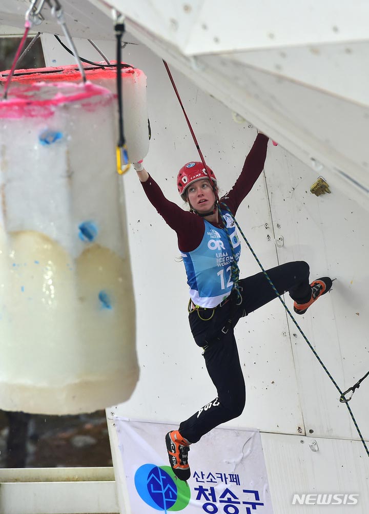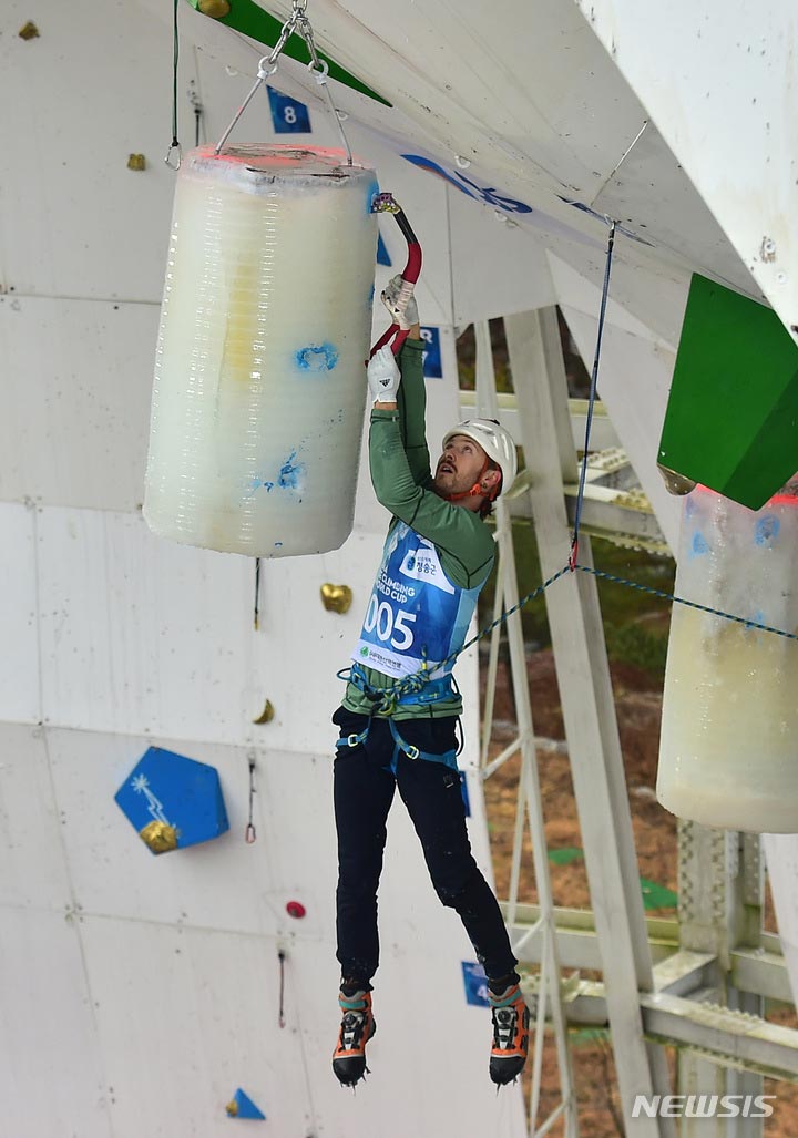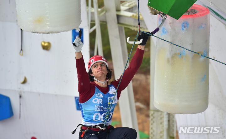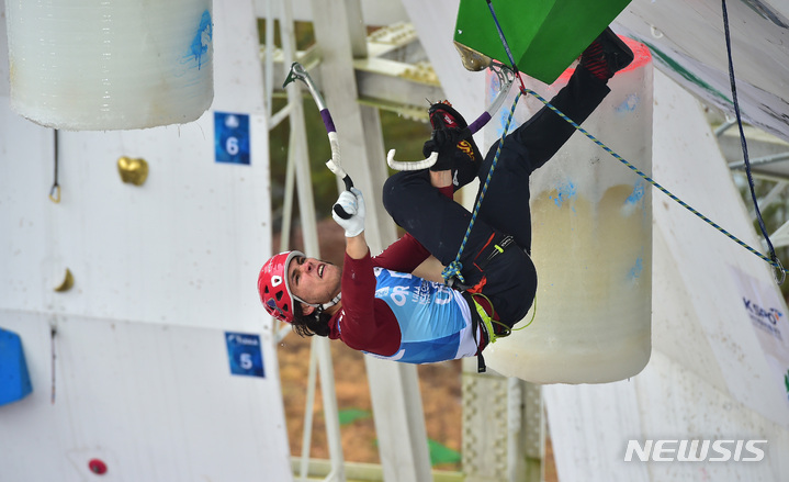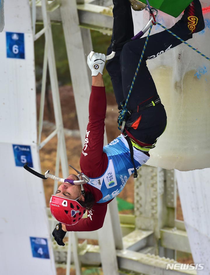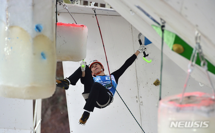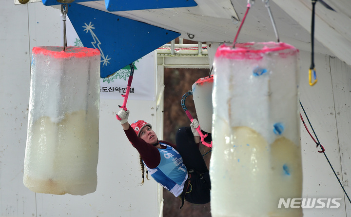 【NEWSIS】15日午後、慶尚北道青松郡の氷壁で「2023青松アイスクライミング・ワールドカップ&アジア選手権大会」リード決勝に参加し、力強く登っていく選手。