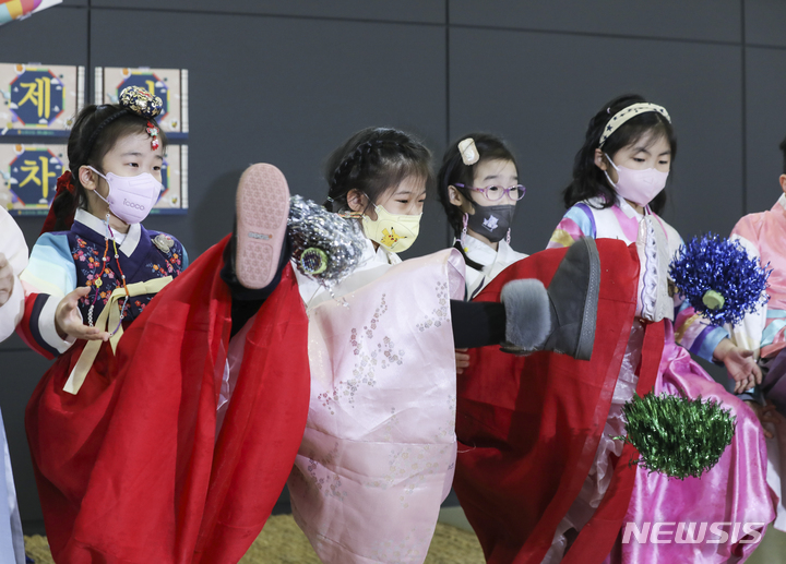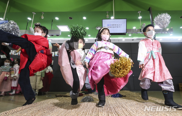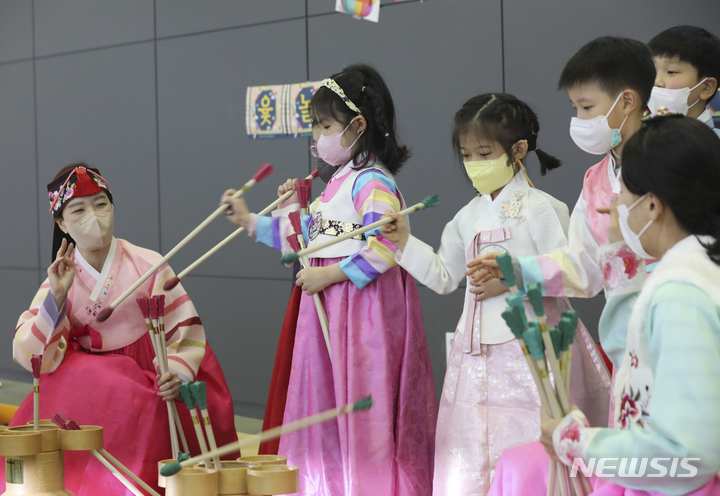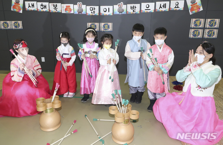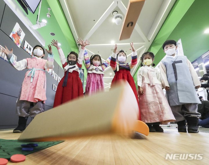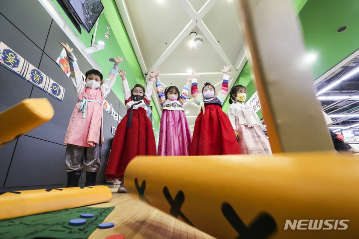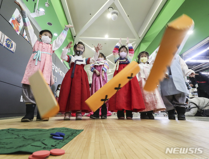 ソウル市瑞草区の大手スーパー「農協ハナロマート良才店」で16日、「投壺」という韓国伝統の遊びをしている子どもたちの様子。