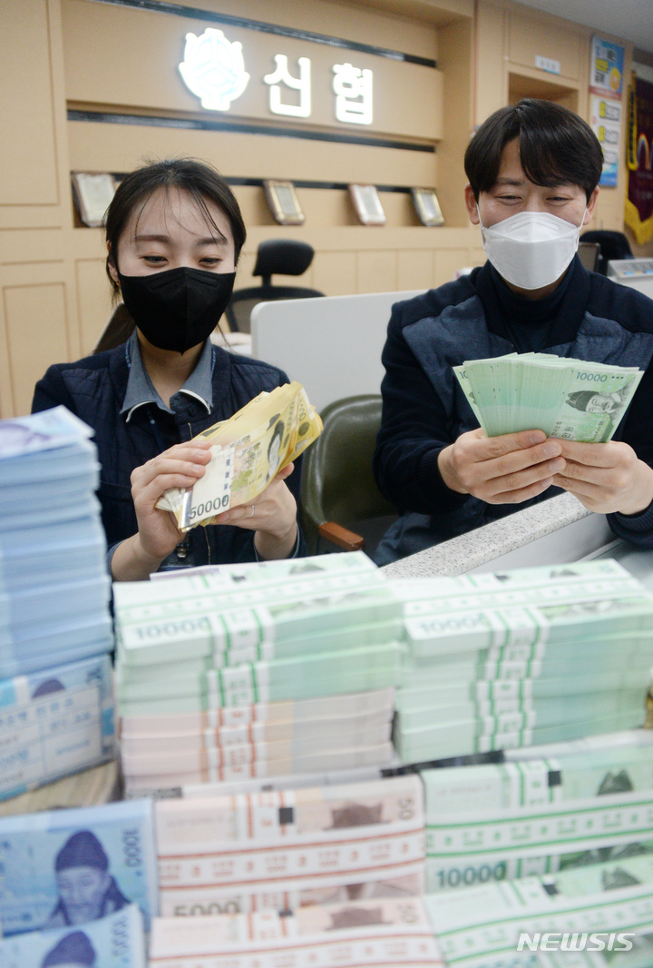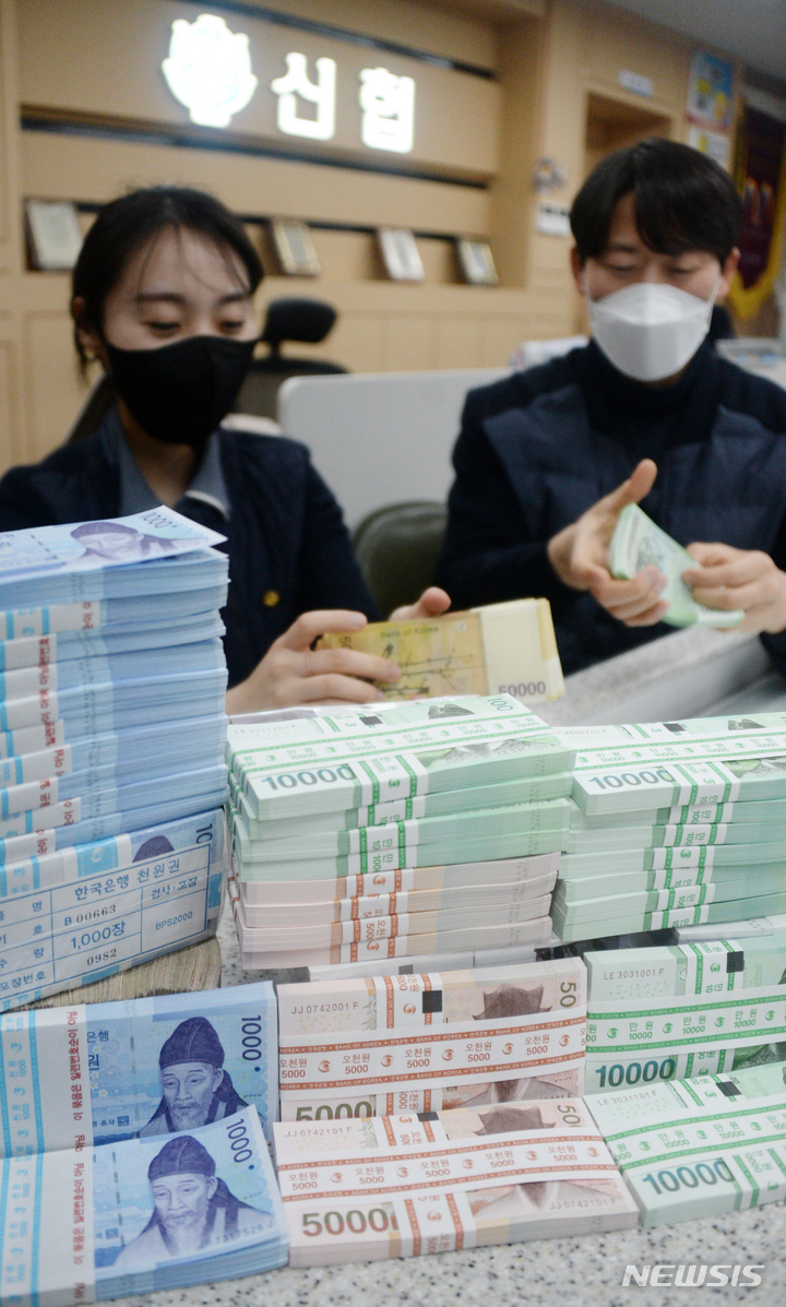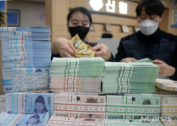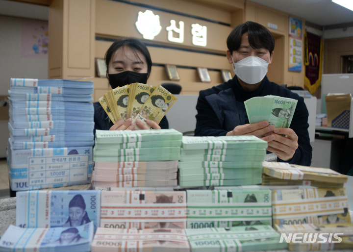 全羅北道全州市のヤンウ信用協同組合本店で16日、職員がお年玉向けの交換に用いる新札の整理をしている様子。