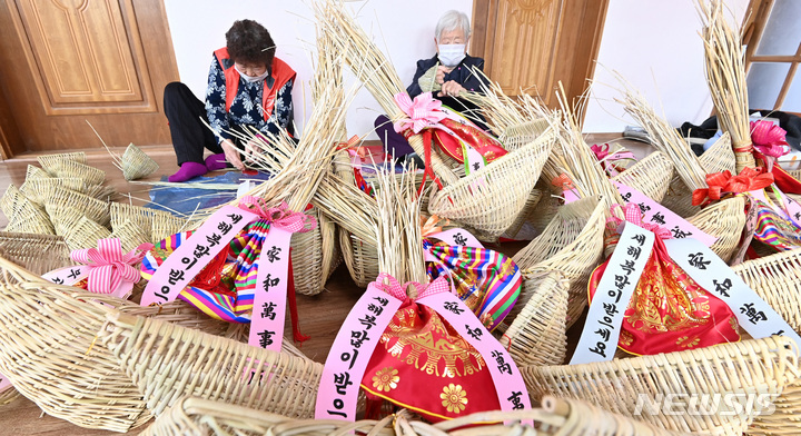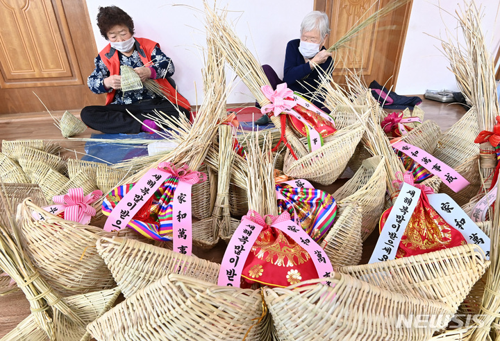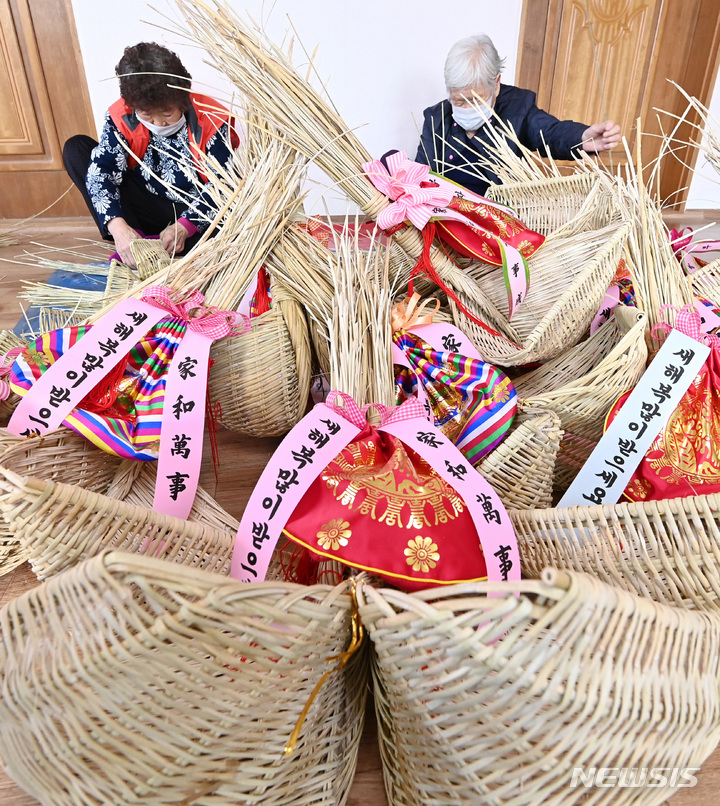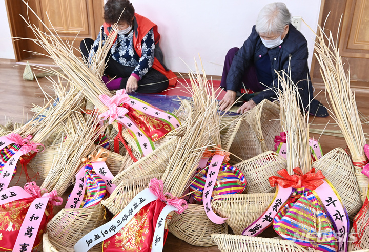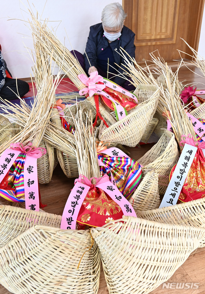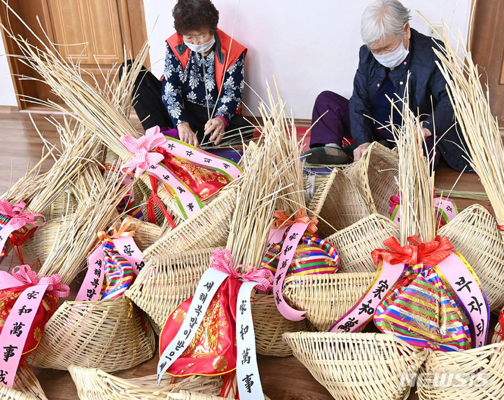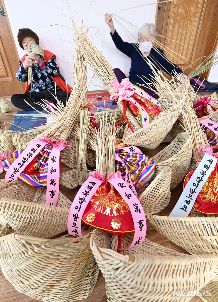 民族の大名節、旧正月(今年は1月22日)まであと四日と迫った18日午後、京畿道安城市竹山面七長里のシンデ村では、高齢者がスズタケを使って福笊籬(ポクチョリ。福じゃくし)を作っていた。