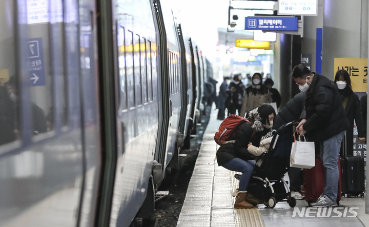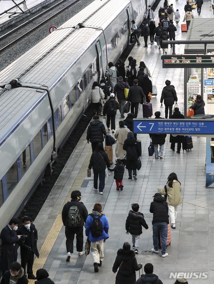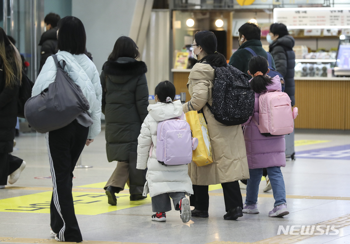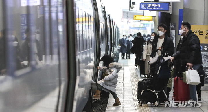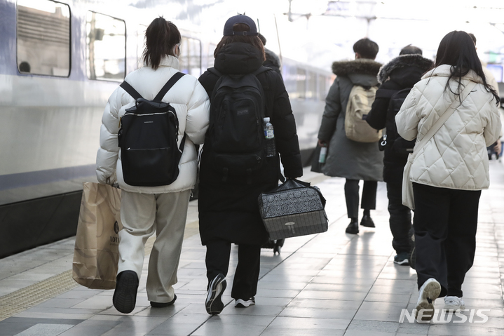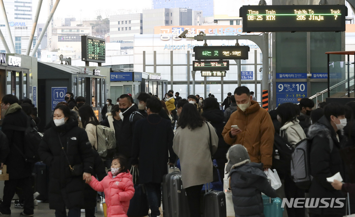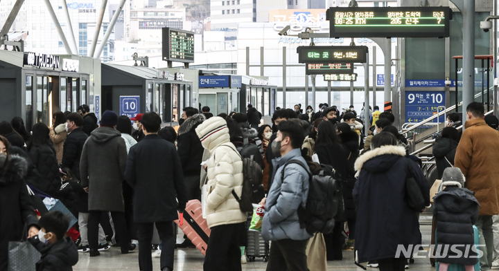 旧正月(今年は1月22日)の名節まであと二日と迫った20日午前、ソウル駅で、土産を持って列車に乗るため移動している帰省客の様子。