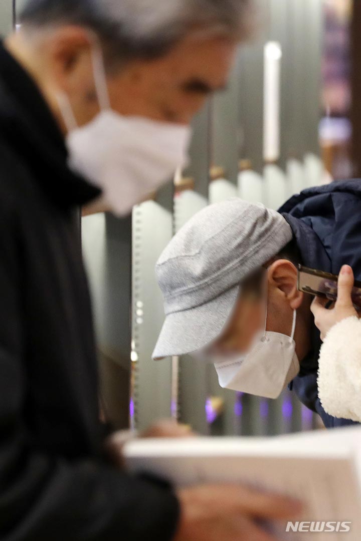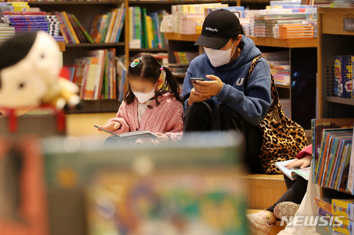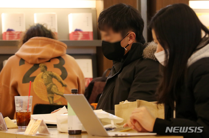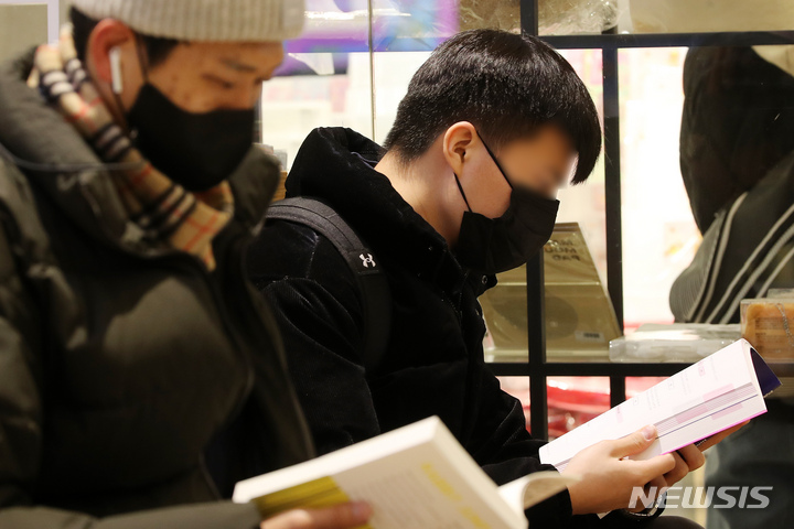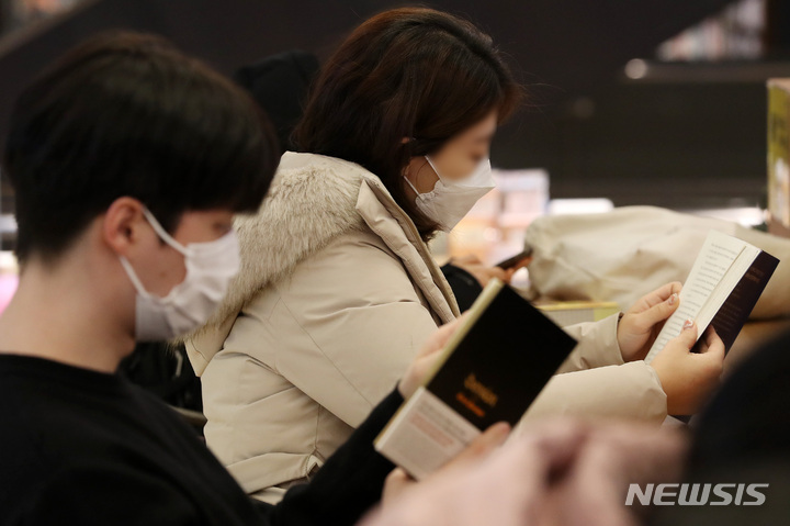 20日午後、ソウル市内の書店で、マスクを着けて本を読んでいる市民の様子。疾病管理庁が同日明らかにしたところによると、今月30日から医療機関・薬局、感染脆弱施設、公共交通機関などを除く室内空間でのマスク着用義務が解除される。
