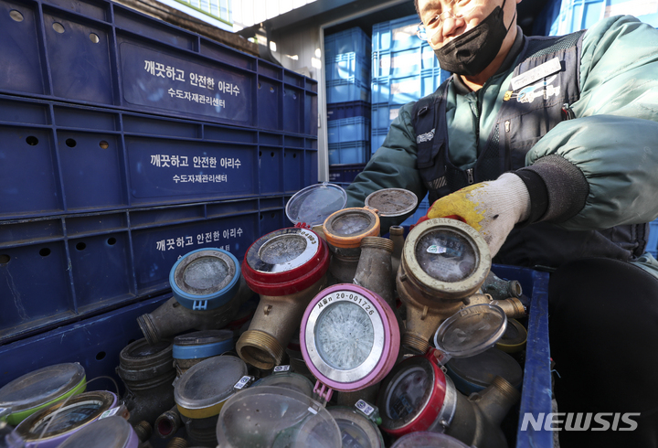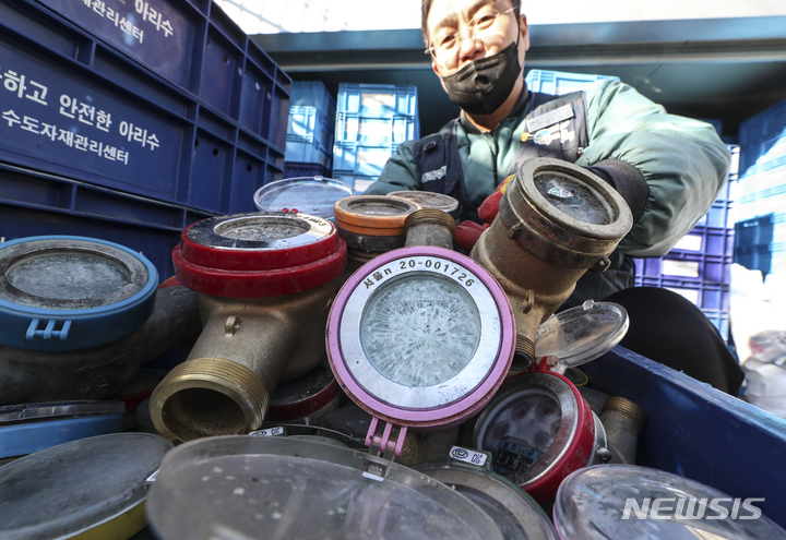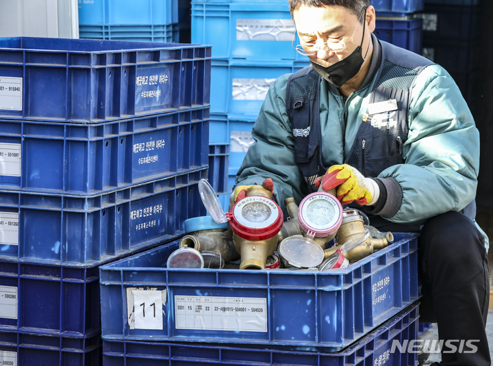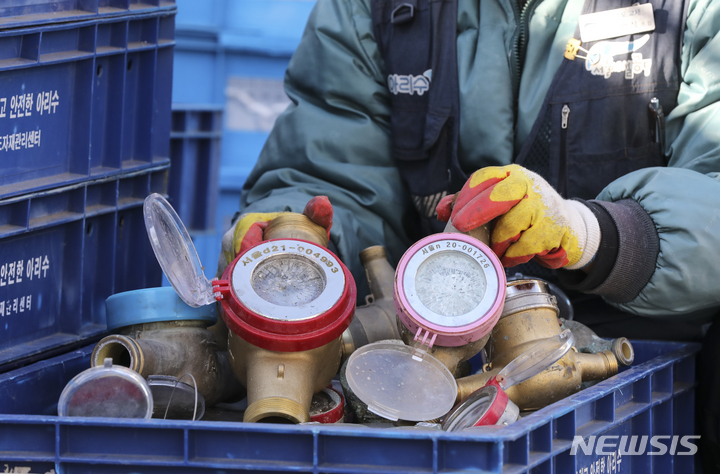 ソウル市が今冬初めて、寒波による水道メーターの凍結破損に対する「深刻」を発令した24日午前、ソウル市鍾路区のポンプ場では、関係者が凍って破裂したメーターを整理していた。水道計量器凍結破損予報には「関心」「注意」「警戒」「深刻」という4段階がある。