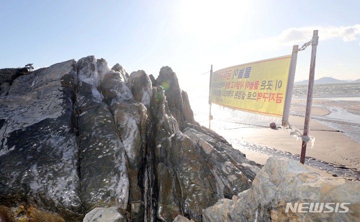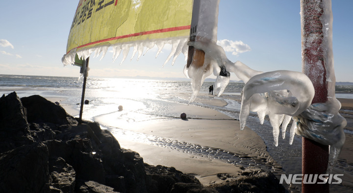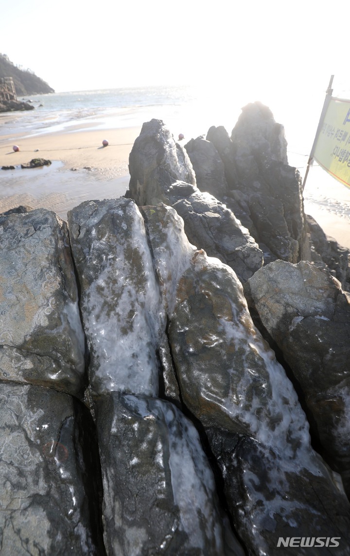 旧正月(今年は1月22日)の連休最終日で、厳しい寒波が到来した24日午後、釜山市沙下区の多大浦海水浴場では、岩場の施設物が凍り付いていた。