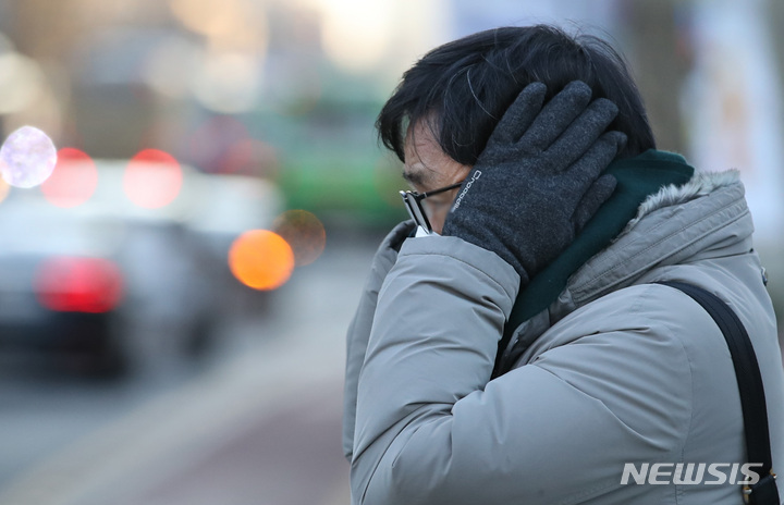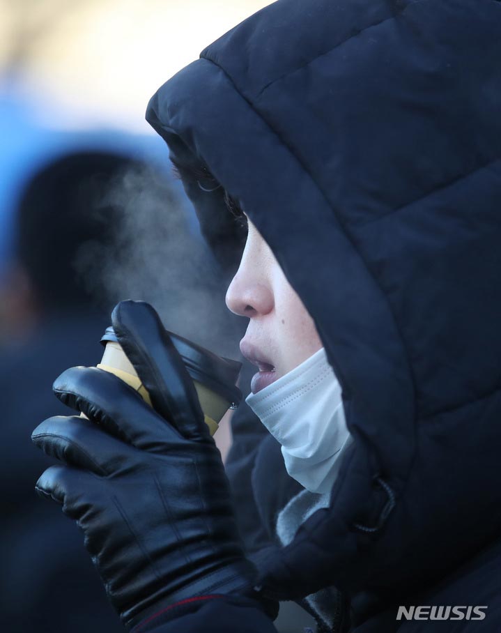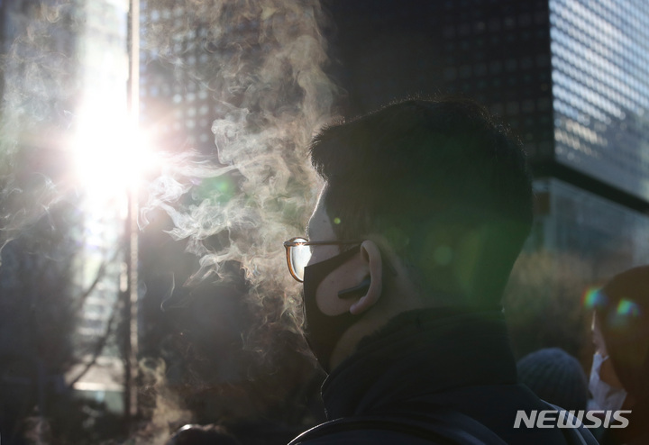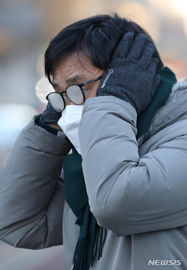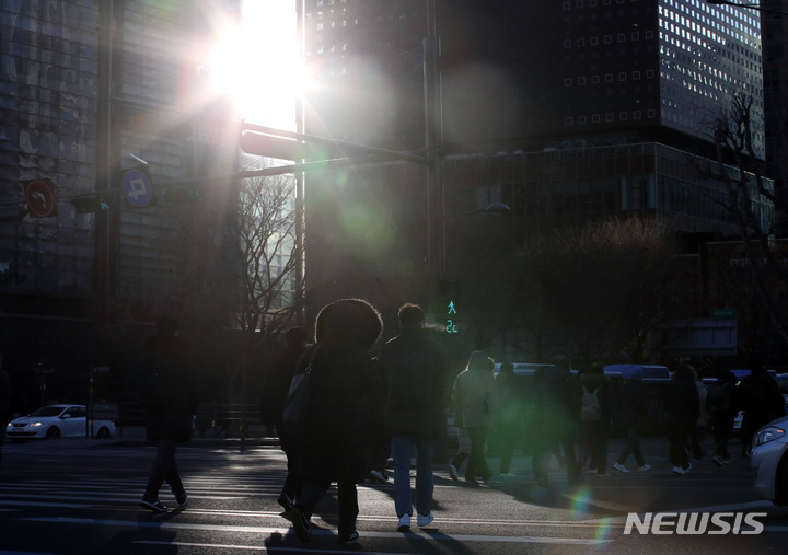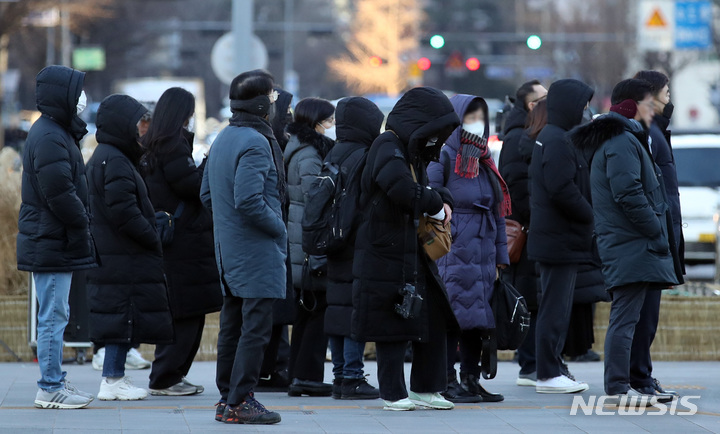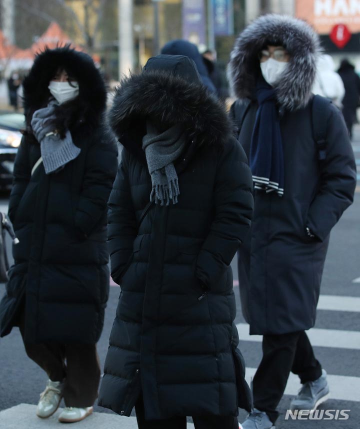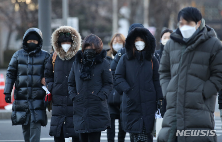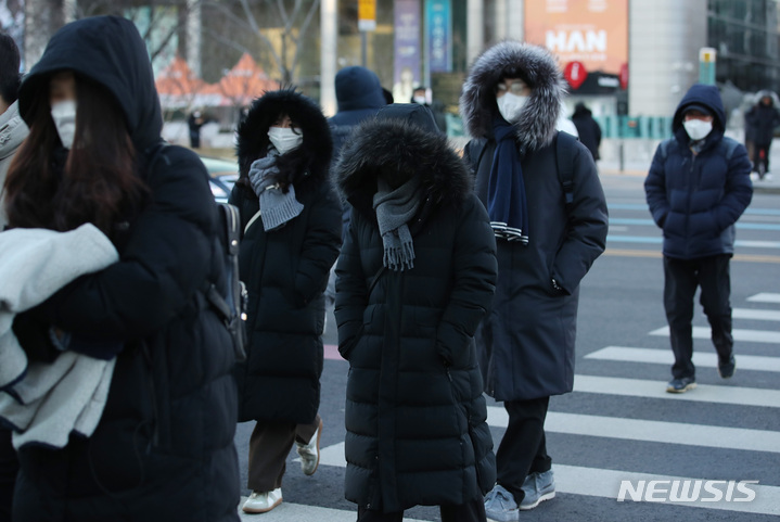 ソウルで朝の最低気温が氷点下18度まで下がるなど、全国各地で寒波特報が発令された25日午前、ソウル市内の世宗路交差点で出勤を急ぐ市民たち。