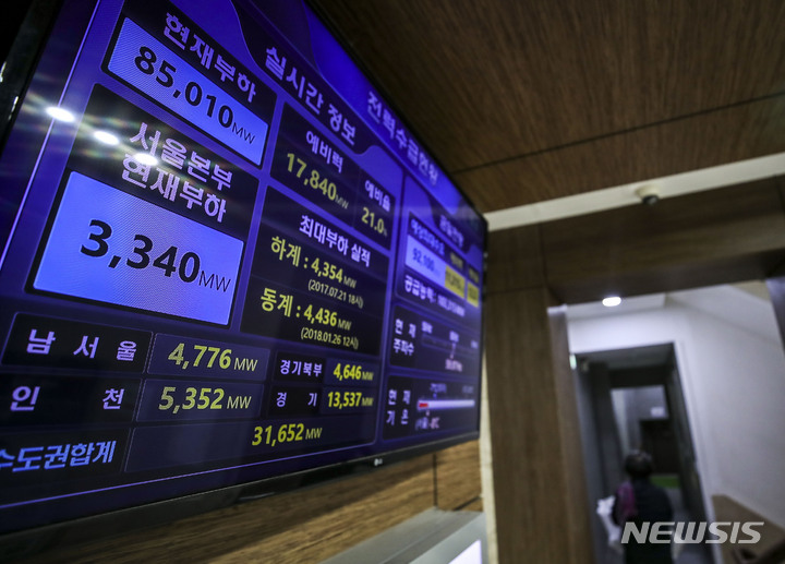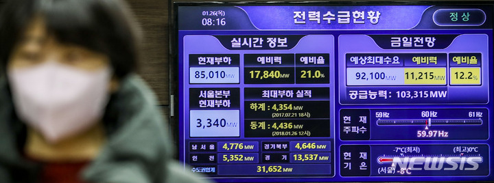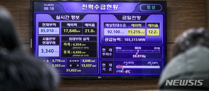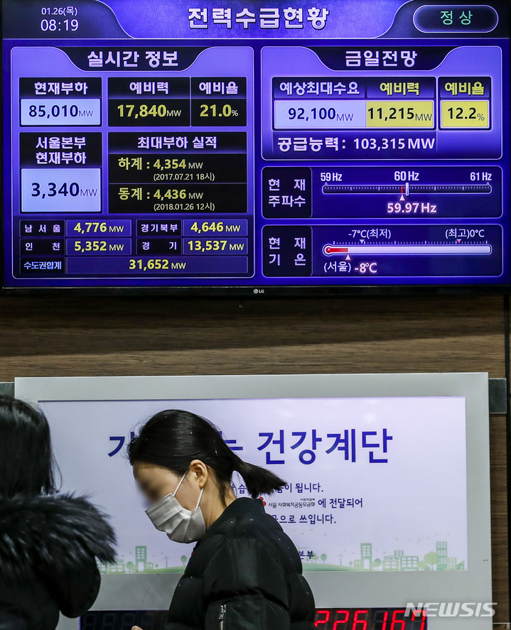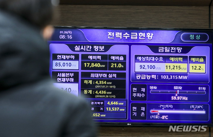 【NEWSIS】北極からの寒波が停滞し、電力需要が高まっている。韓国電力取引所によると、25日3時時点の電力需要は82.1ギガワット(GW)を記録したとのことだ。その後、やや減少して80 GW台を維持しているという。写真は26日午前、ソウル市中区の韓国電力公社ソウル本部に設置されたモニターに表示されている電力需給現況。