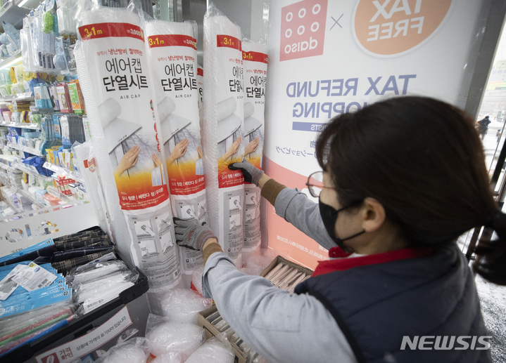 連日寒さが続いている26日午前、ソウル市内の生活用品売り場にて、従業員が暖房補助用品を整理している様子。
