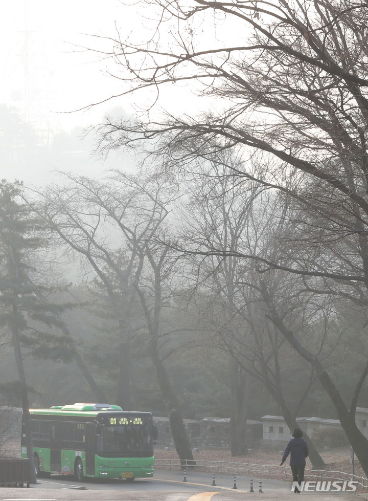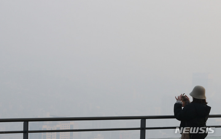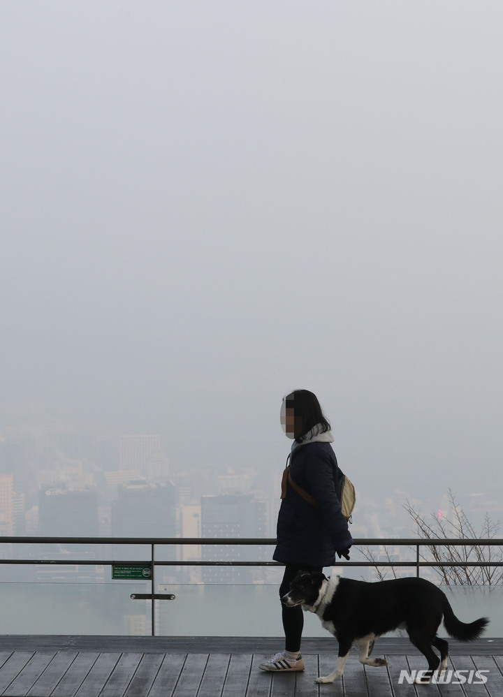 首都圏地域に高濃度のPM2.5などの微小粒子状物質非常低減措置が施行された6日午前、ソウル市竜山区の南山を散策をする市民。