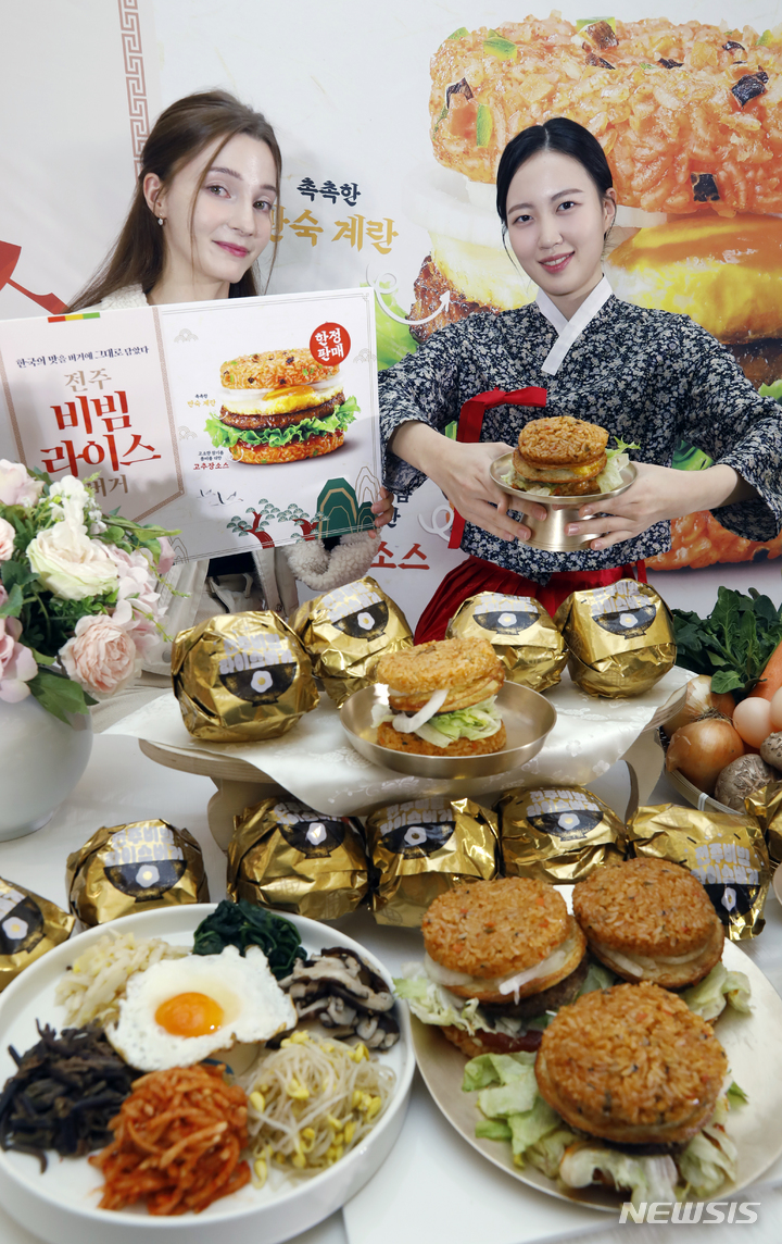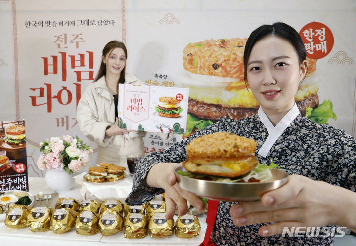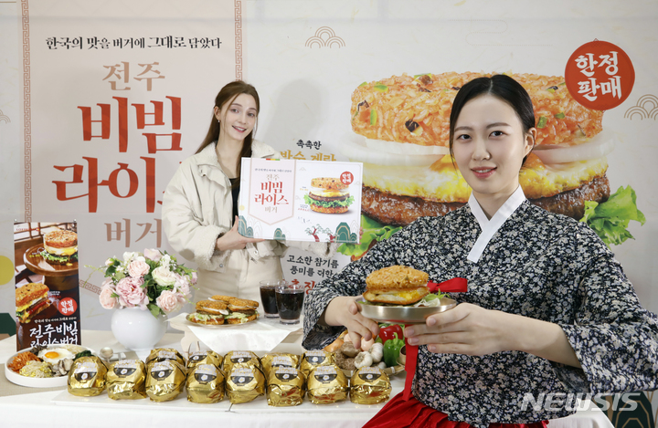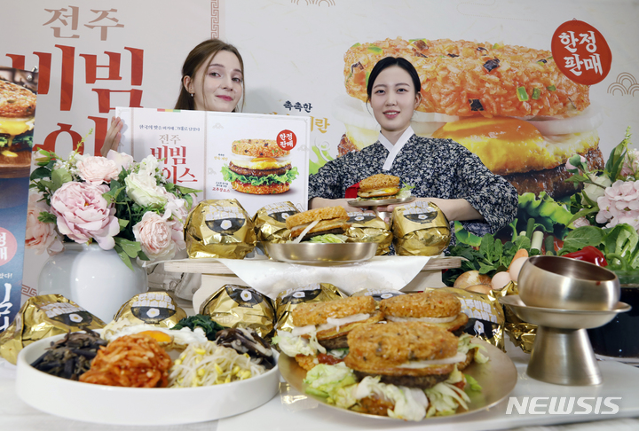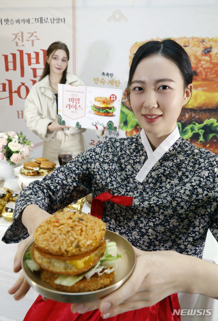 ソウル市内のロッテリア弘大店で7日、コンパニオンらが新商品「全州ビビンライスバーガー」を紹介した。これは、およそ7年ぶりに発売されたライスバーガー新商品で、韓国を代表する料理ビビンバを再解釈したメニューだ。