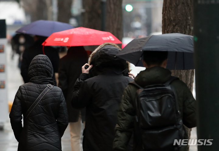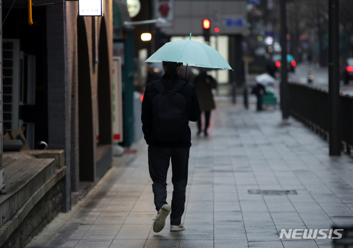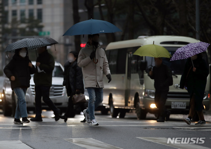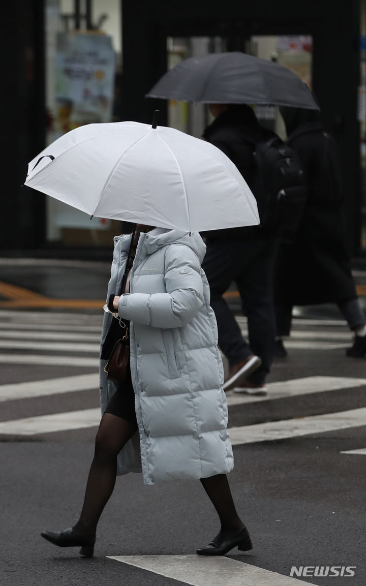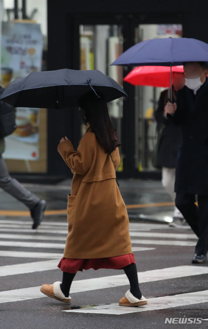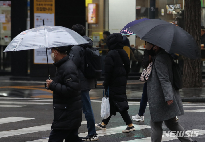 ソウル地域で雨が降っている10日、ソウル市庁付近では、傘をさして出勤する人たちの姿が見られた。