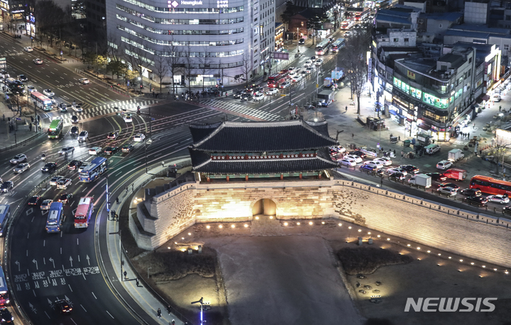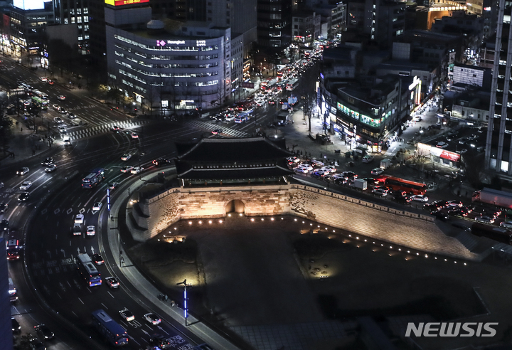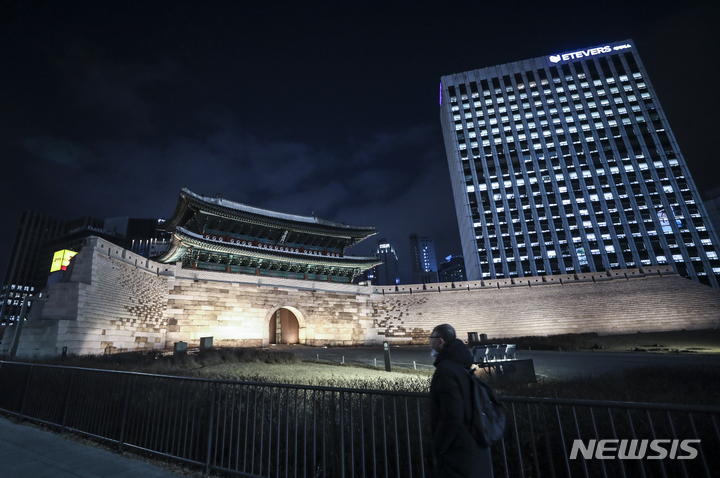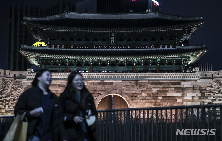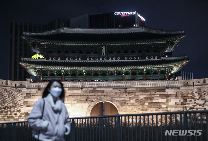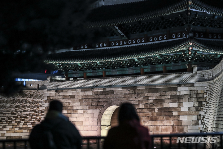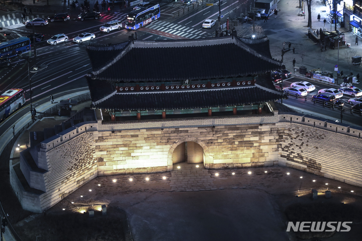 10日夜、ソウル市内の崇礼門(通称:南大門)がライトアップされていた。文化財庁は、防災の日および崇礼門火災から15年たつに当たり、今月末まで崇礼門夜間景観照明の点灯時間を一時的に調整すると発表した。