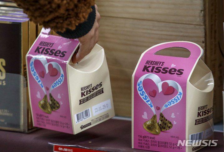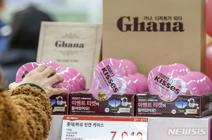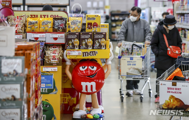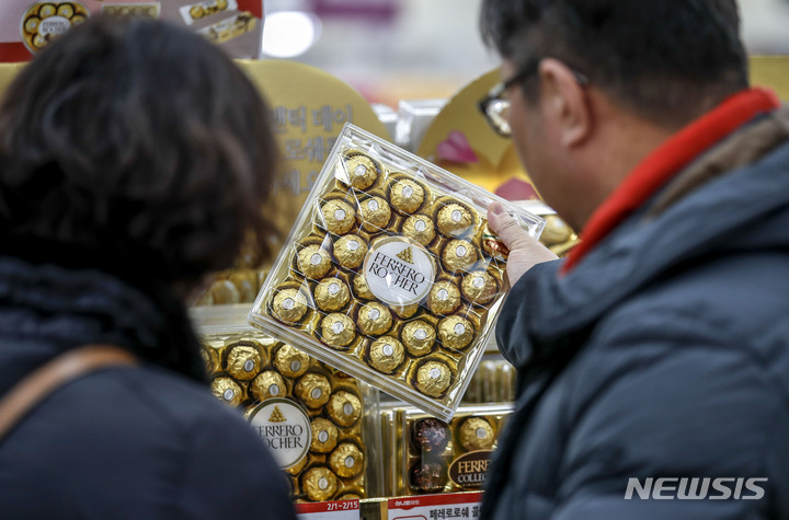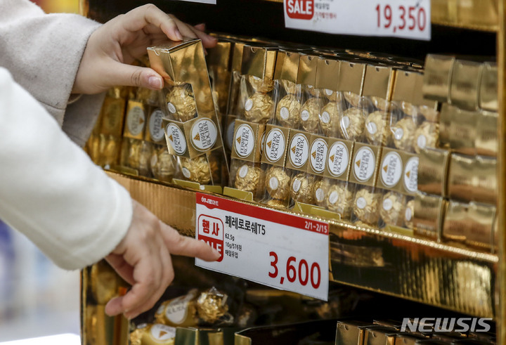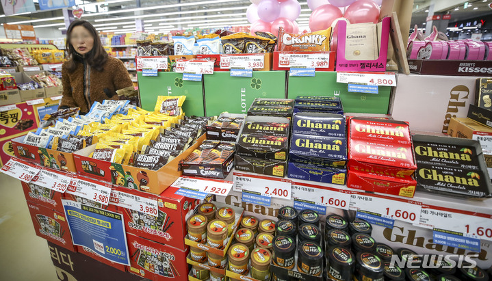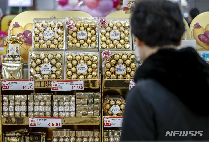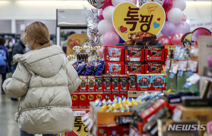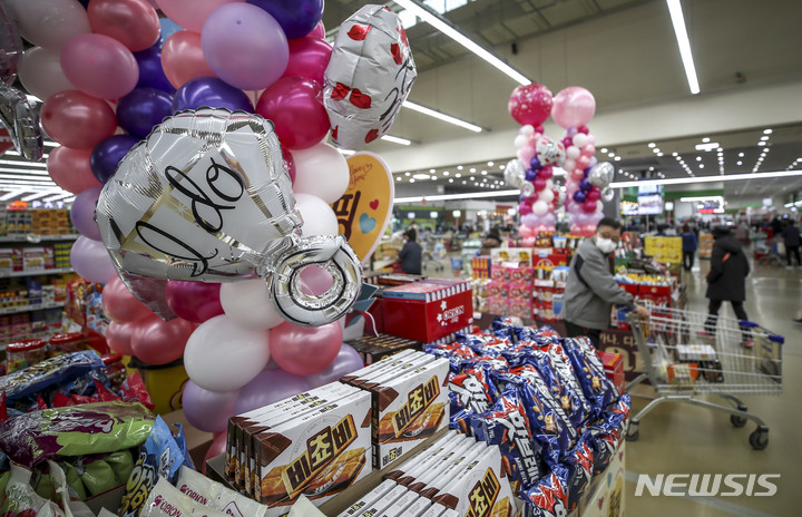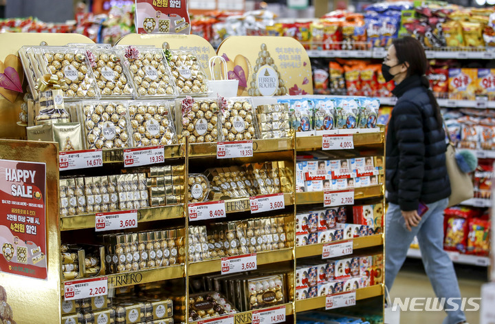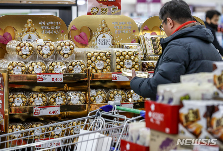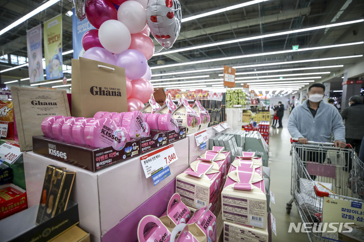 【NEWSIS】バレンタインデーまであと二日となった12日午前、ソウル市瑞草区の大型スーパー「ハナロ・マート」良才店で、チョコレート製品を見る買い物客。