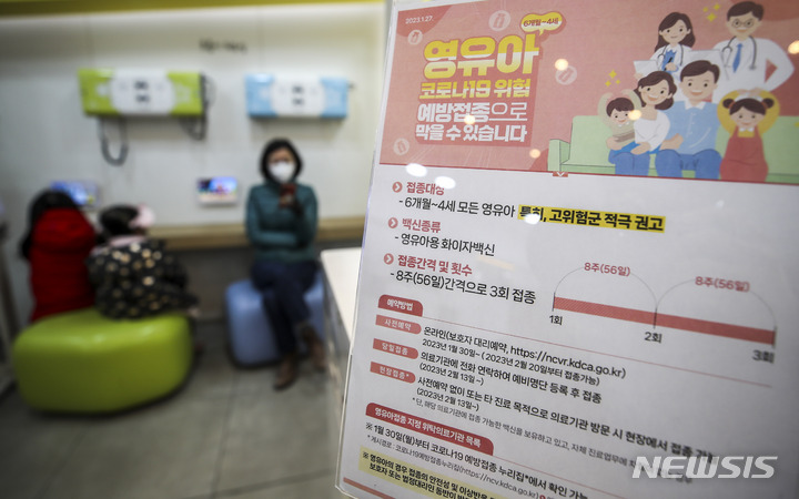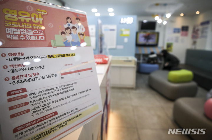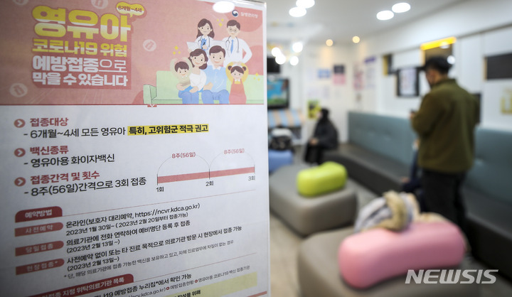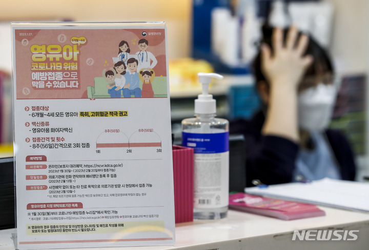 満6カ月から満4歳以下の乳幼児に対する新型コロナワクチン予防接種が始まった13日午前、ソウル市内のある小児青少年科クリニックに、新型コロナ予防接種の案内が掲示されている様子。