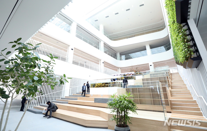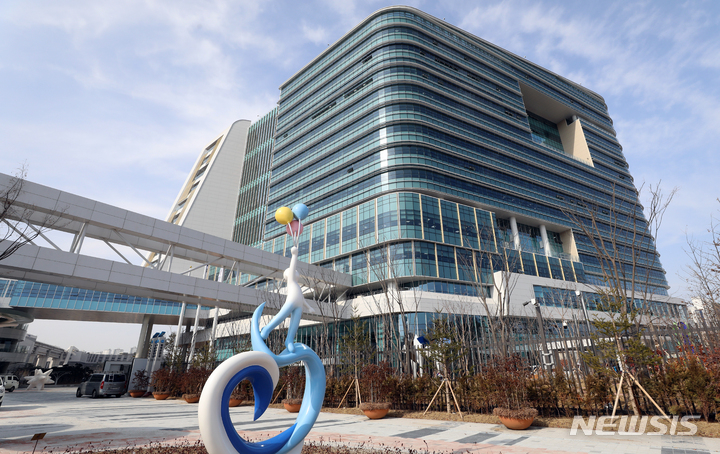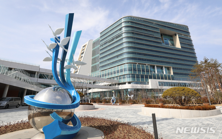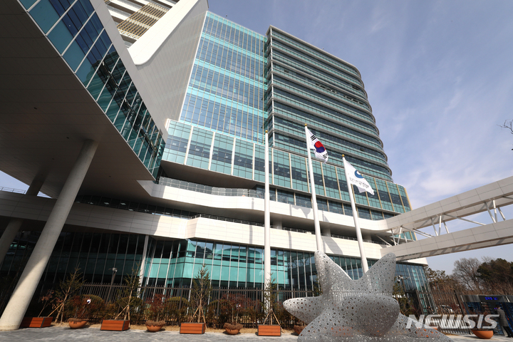 行政安全部(省に相当。以下同じ)の転入をあすに控えた14日、太極旗と政府旗が翻る政府世宗庁舎中央棟(世宗市オジン洞)。地下3階、地上15階建てで延床面積13万平方メートル規模の政府世宗庁舎中央棟には、企画財政部と行政安全部が入る予定だ。