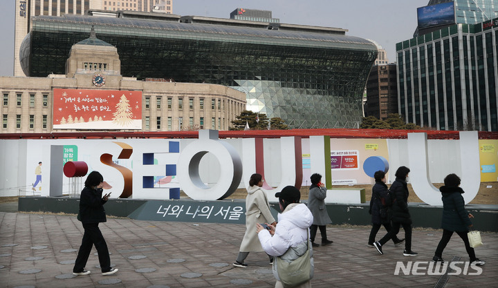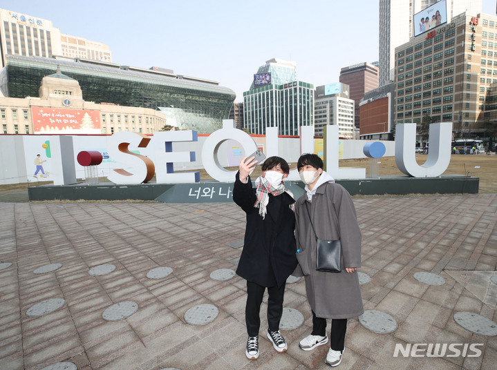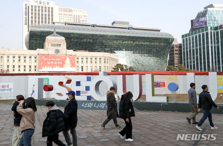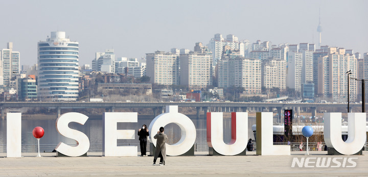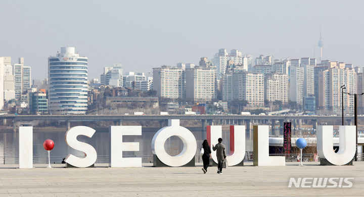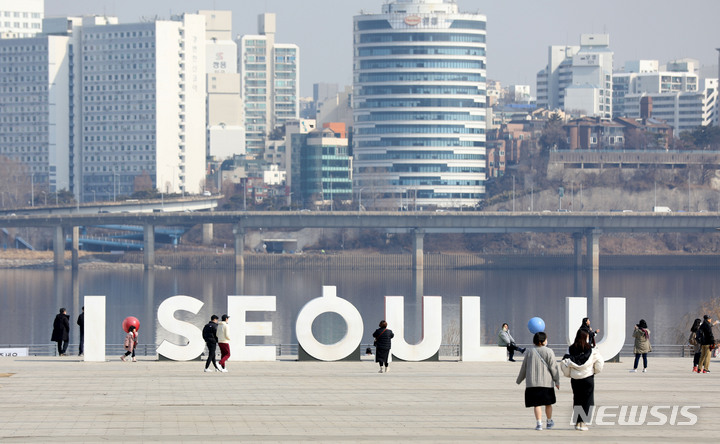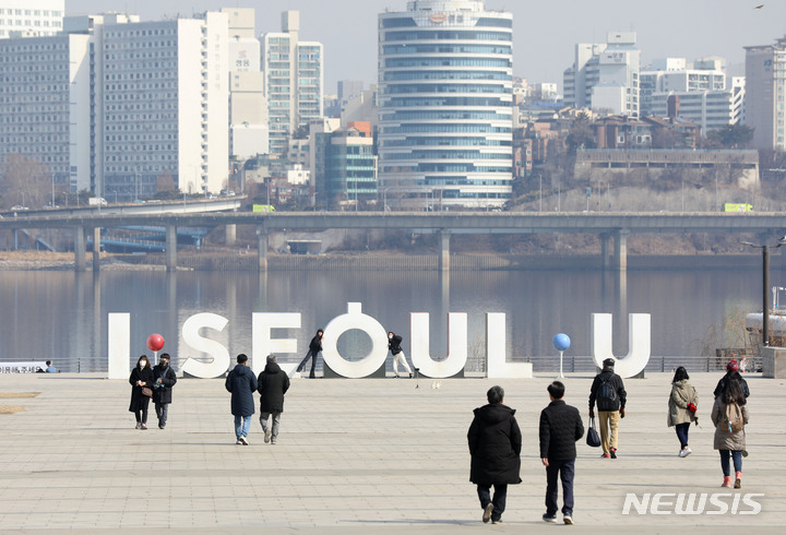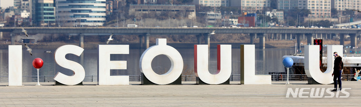 17日、ソウル市汝矣島の漢江公園にある「I・SEOUL・U」造形物の前を行き交う市民の様子。ソウル市は、新たなブランド開発に伴い、既存のブランド「I・SEOUL・U」の造形物を18日から撤去し始め、3月までに全て無くすことを明らかにした。