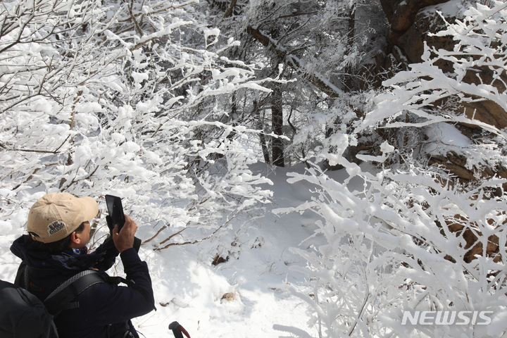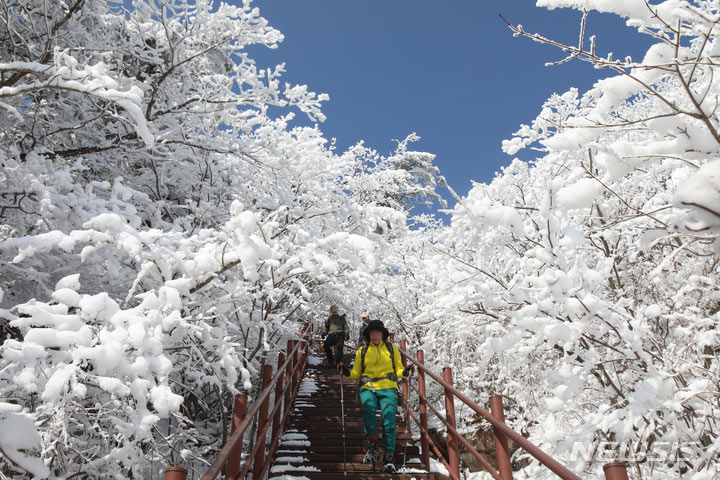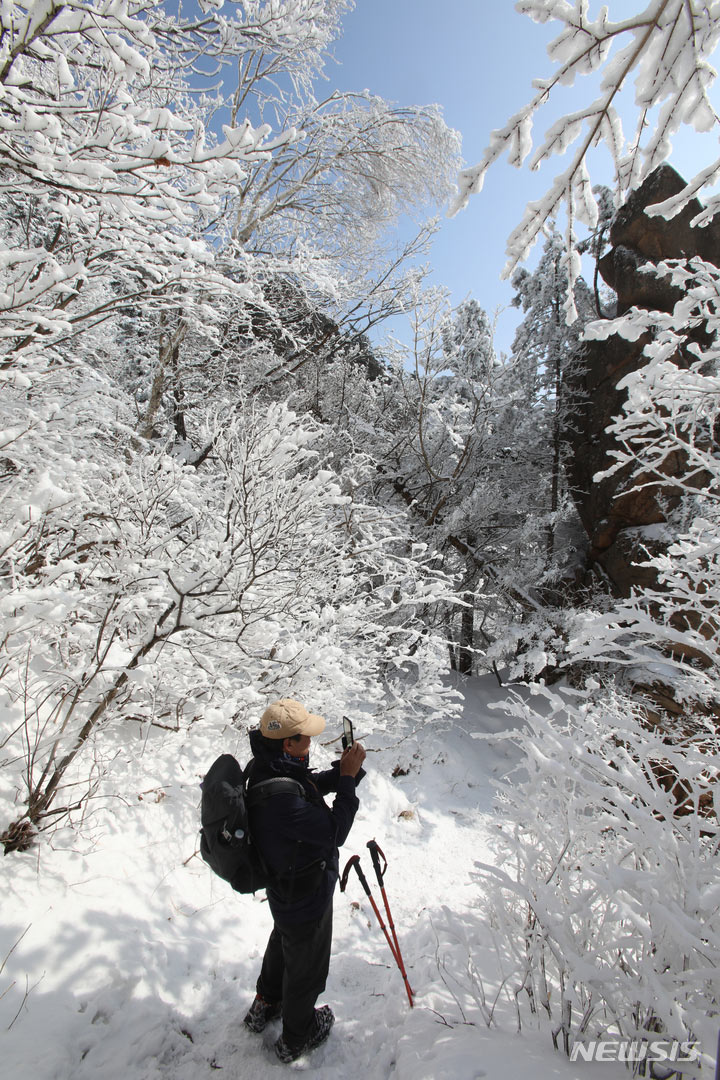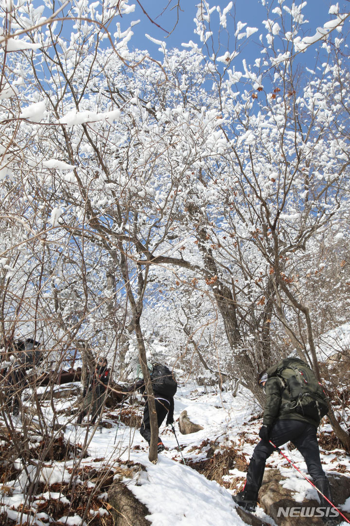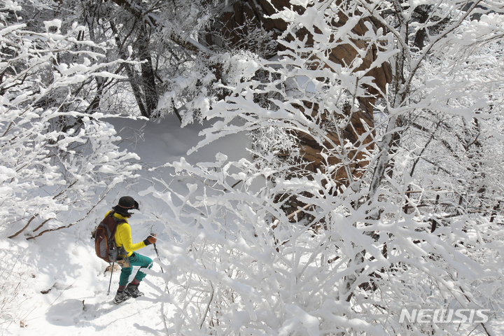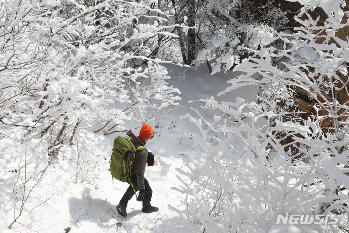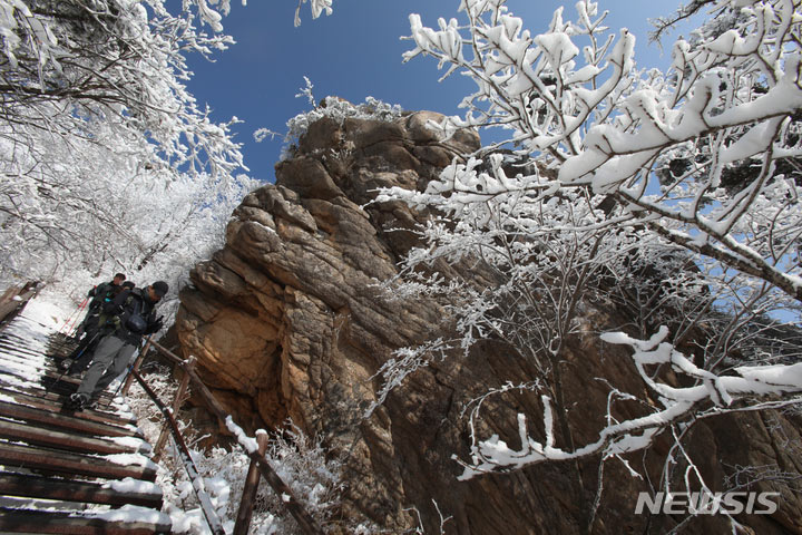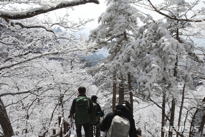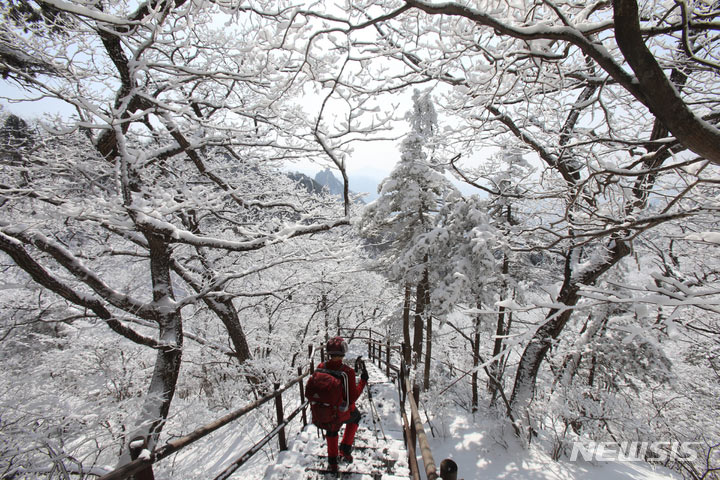 登山客が17日午後、真っ白な雪がどっさり積もった江原道麟蹄郡の雪岳山国立公園の寒渓嶺から西北稜線-大勝嶺、西北稜線-中青待避所に向かって慎重に一歩ずつ進んでいる。