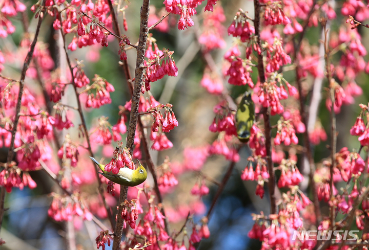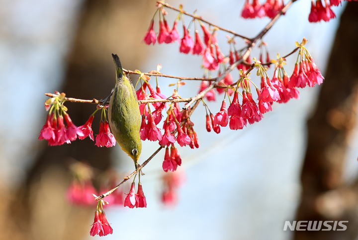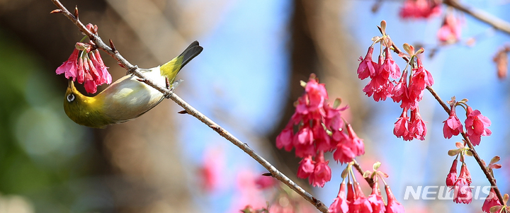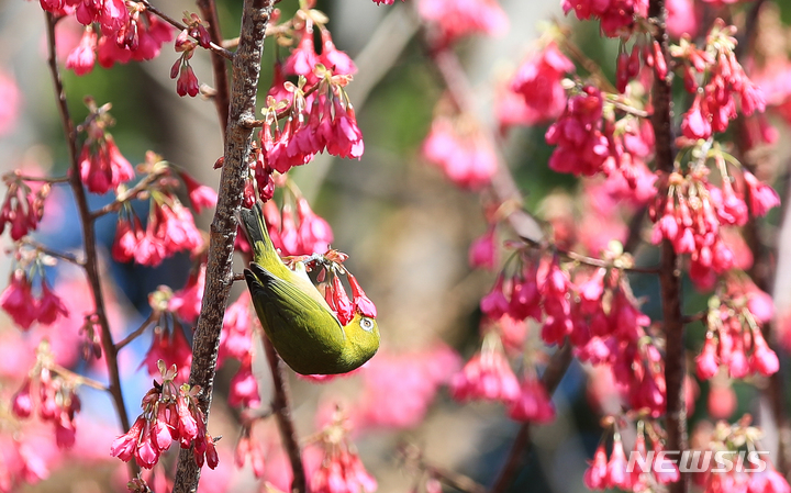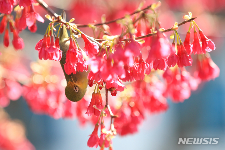 まだ肌寒いが晴天となった20日午後、済州島西帰浦市の李仲燮通りに咲いたカスミザクラにメジロが飛来し、蜜を吸っていた。
