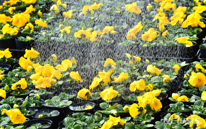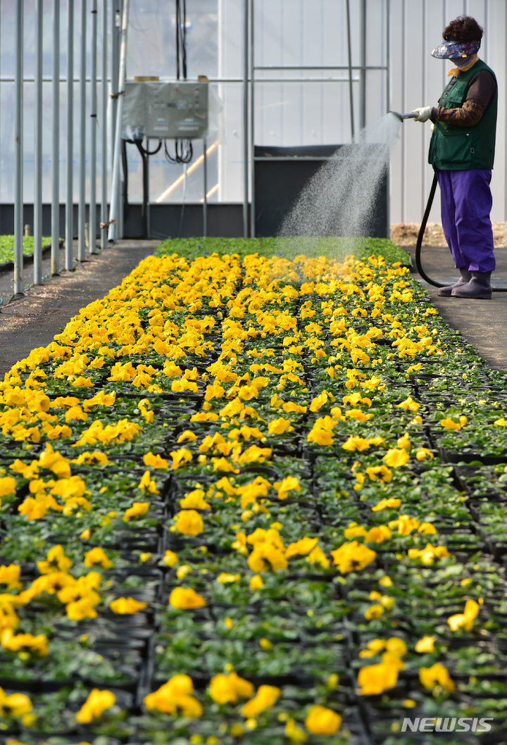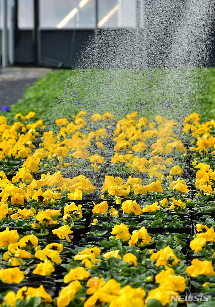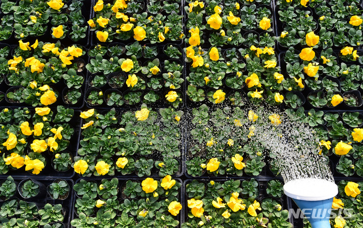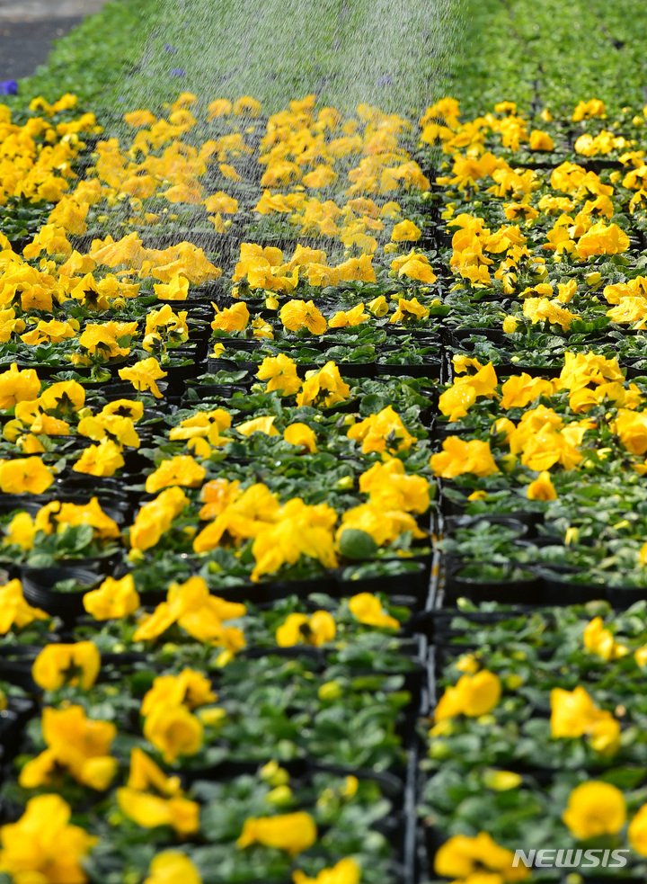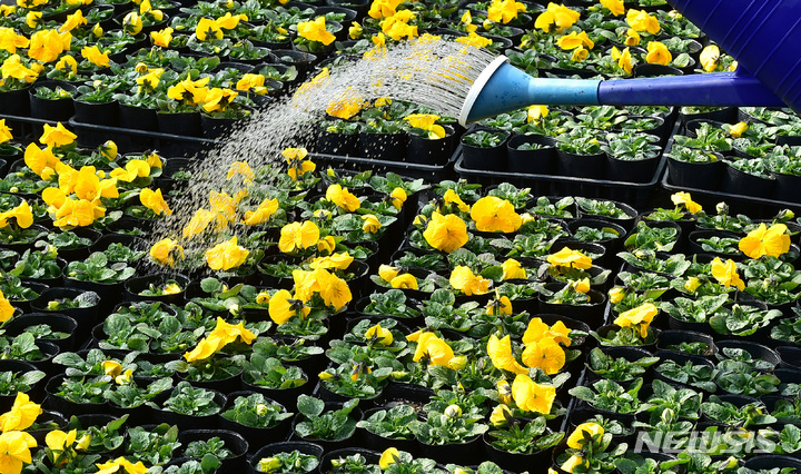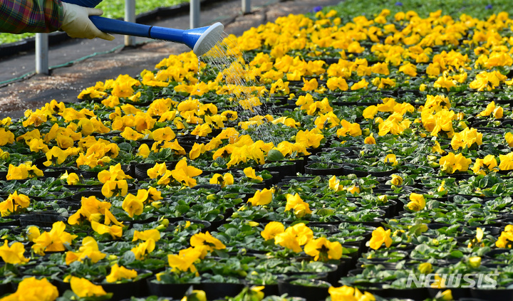 大邱市達西区大泉洞の大邱樹木園城西1養苗場で20日午後、開花したパンジーの苗に職員が水をやっているところ。ここで栽培された花々は、大邱地域8カ所の公共機関に配られ、都心を飾るのに用いられる。