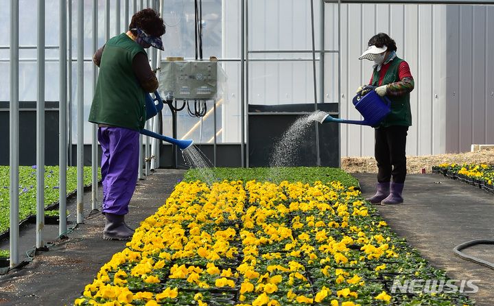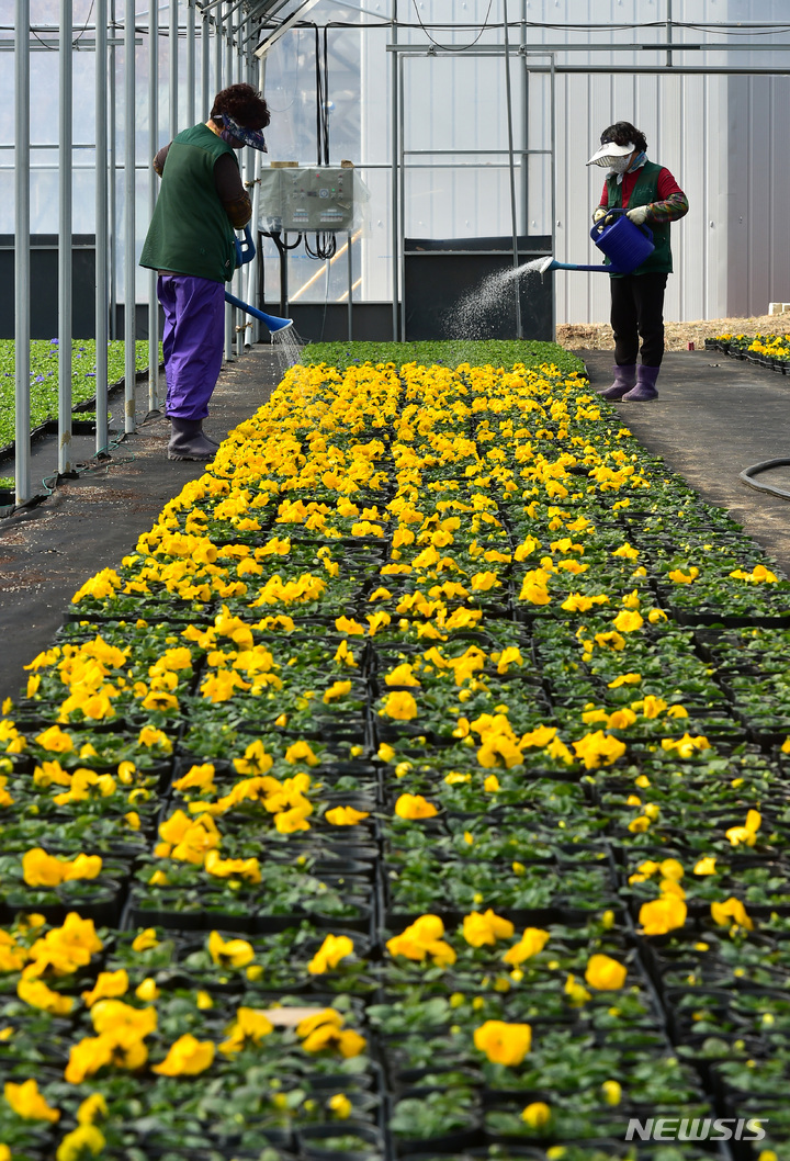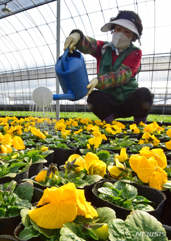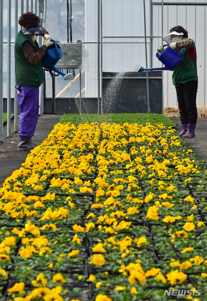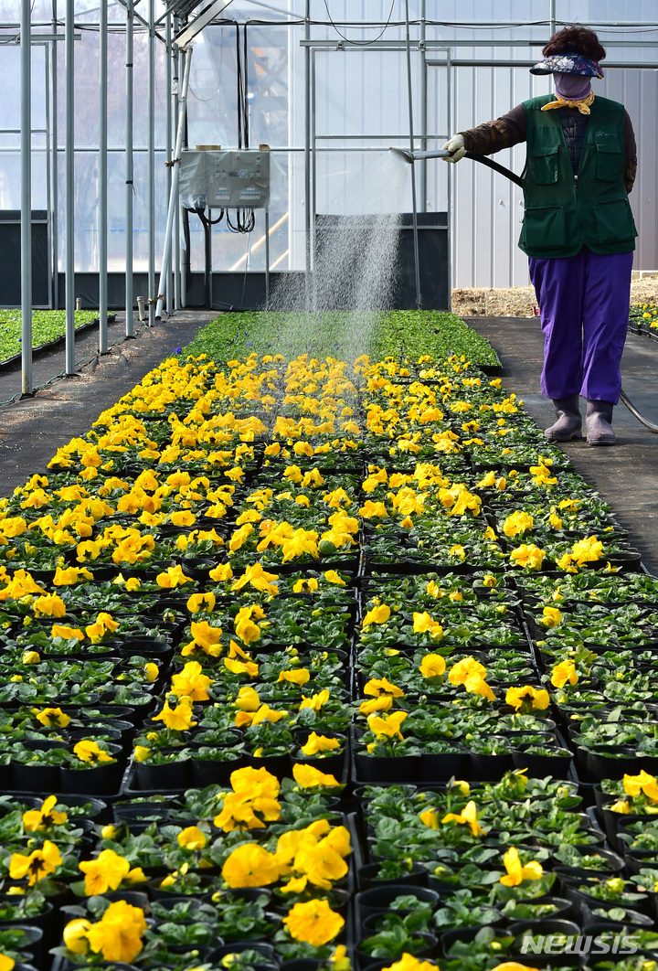大邱市達西区大泉洞の大邱樹木園城西1養苗場で20日午後、開花したパンジーの苗に職員が水をやっているところ。ここで栽培された花々は、大邱地域8カ所の公共機関に配られ、都心を飾るのに用いられる。