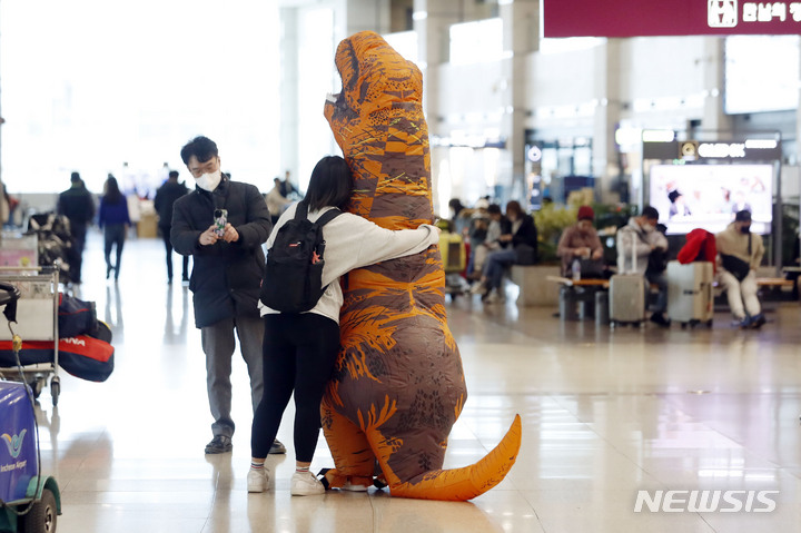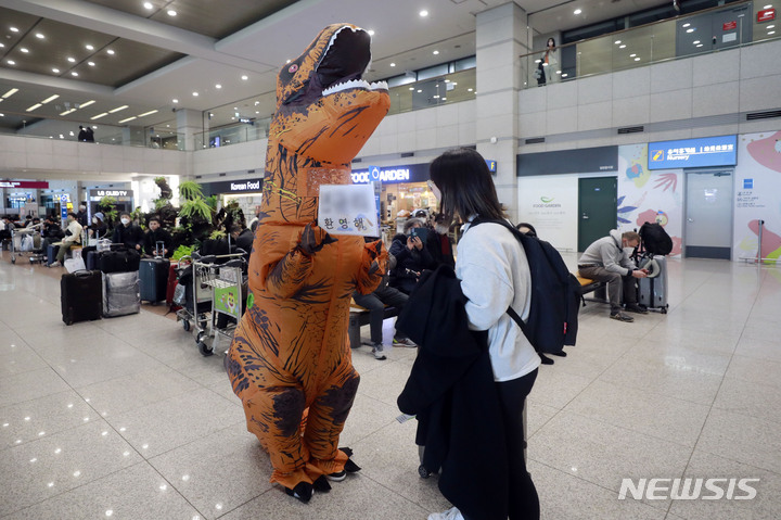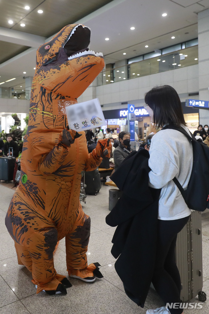 仁川国際空港で20日、帰国する姉のために恐竜の着ぐるみ姿でイベントをしている人の様子。