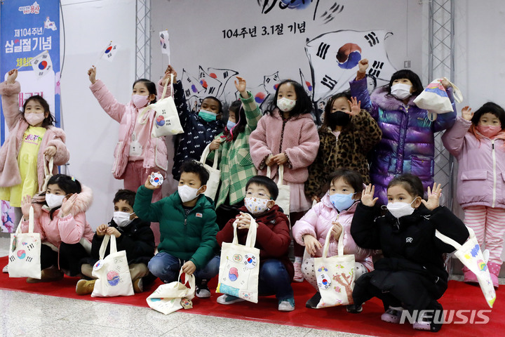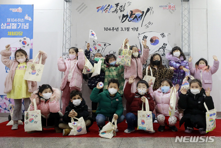 ソウルの竜山アートホールで21日、オリニチプ(民間保育施設)の園児たちが、三一節記念太極旗エコバッグを作って記念撮影をしている様子。
