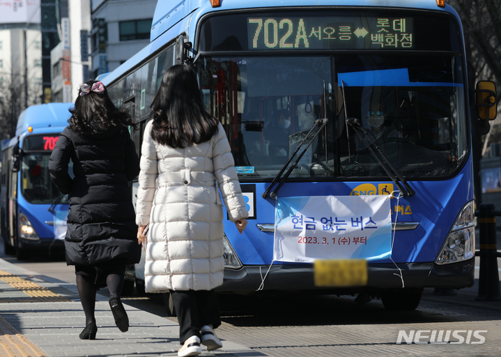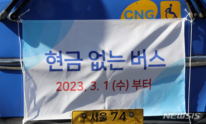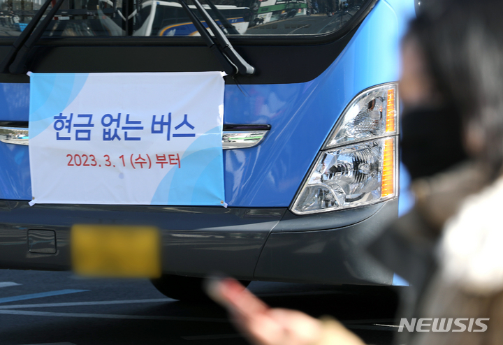 ソウル市中区の世宗大路交差点で21日、「キャッシュレスバス」案内の垂れ幕を取り付けたバスが運行している様子。ソウル市は3月1日から、キャッシュレスバスの試験運行を108路線に大幅拡大する。ソウル市によると、キャッシュレスバスは既存の18路線に90路線を追加し、計108路線で運行する予定だ。