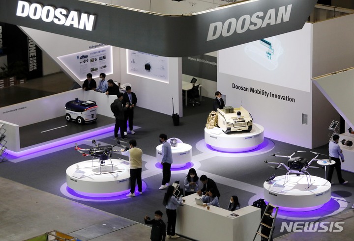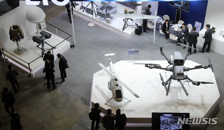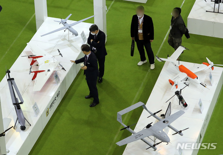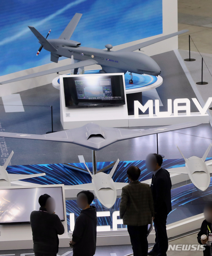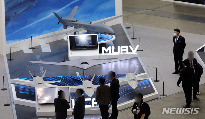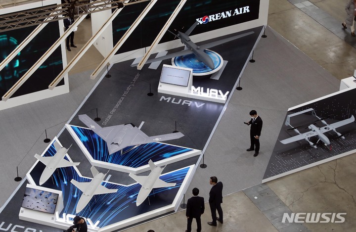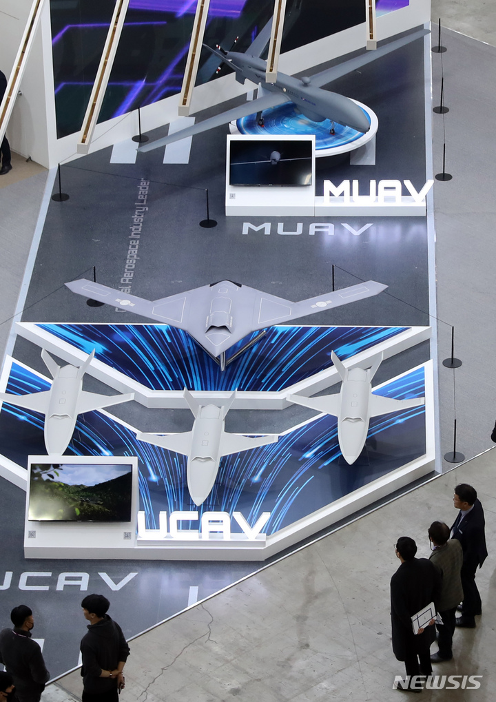 【NEWSIS】「2023ドローン・ショー・コリア」が開幕した23日、釜山市海雲台区の釜山展示コンベンションセンター(BEXCO)第1展示場を訪れ、大韓航空のブースに展示されている各種戦術無人機やステルス無人機などを見る人々。25日まで開催される「2023ドローン・ショー・コリア」では、関連企業172社のドローン展示会やカンファレンス、さまざまな体験イベントなどが行われる。