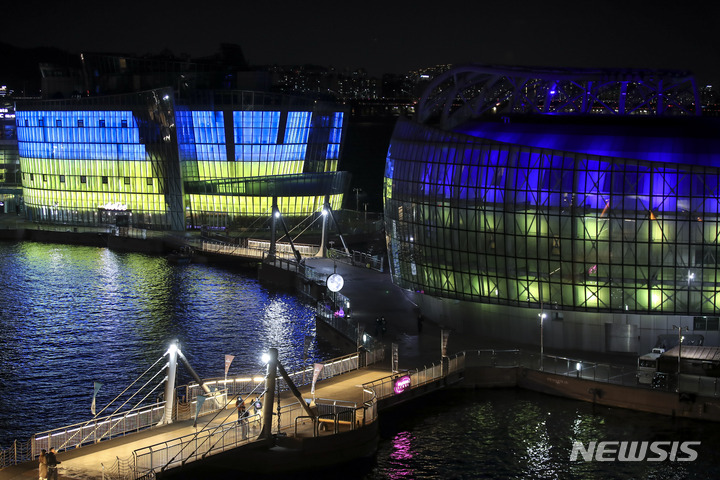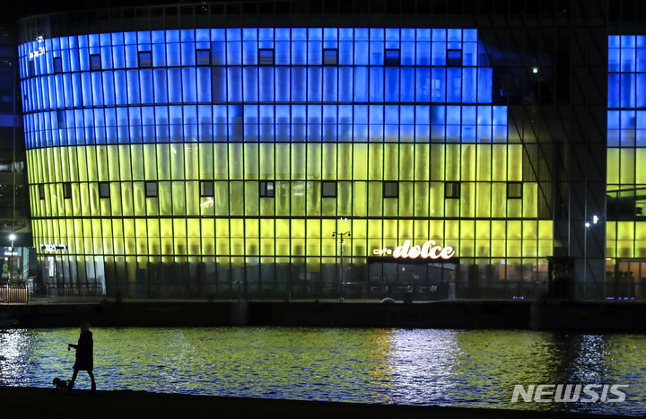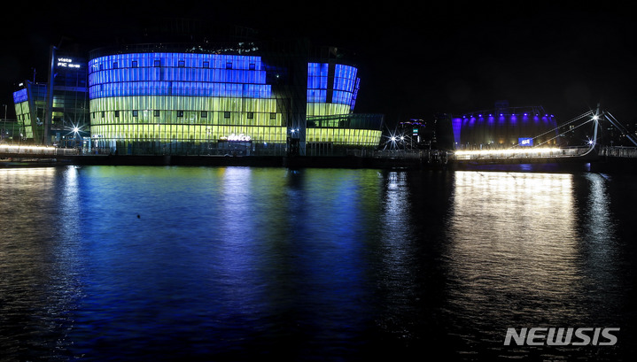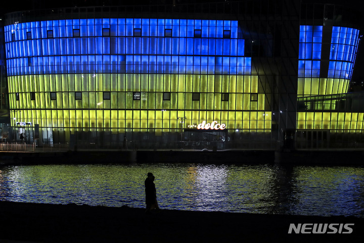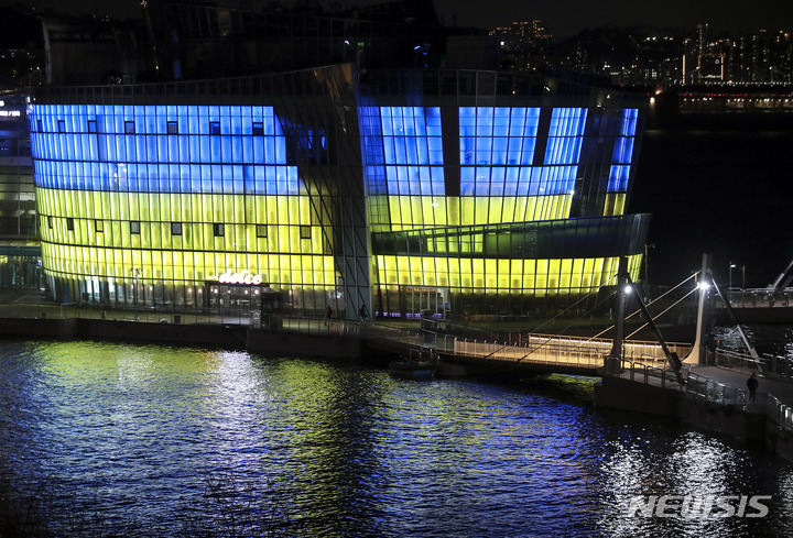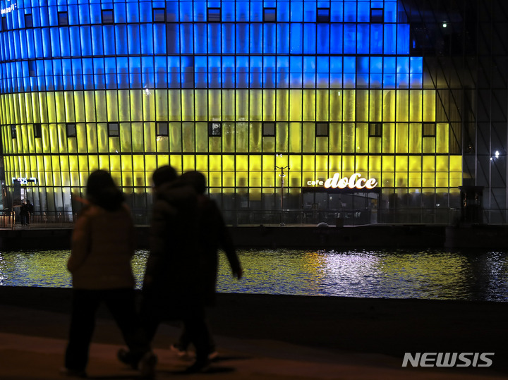 ロシアによるウクライナへの軍事侵攻が始まってから1年たった24日午後、ソウル市瑞草区の盤浦漢江公園内にあるセビッソムは、ウクライナの国旗カラーでライトアップされていた。