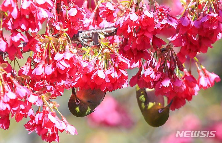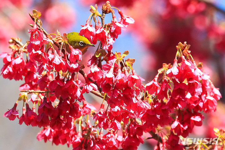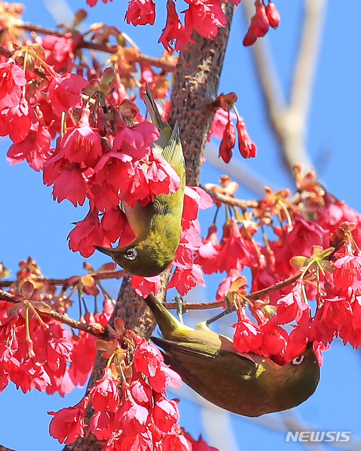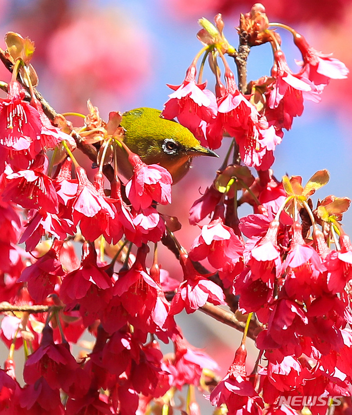 【NEWSIS】青空が広がった26日午前、済州特別自治道(済州島)西帰浦市の「李仲燮(イ・ジュンソプ)通り」で、紅桜のみつを吸うメジロ。
