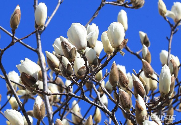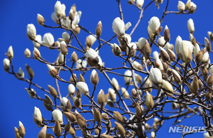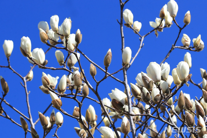 【NEWSIS】よく晴れた26日午前、済州特別自治道(済州島)西帰浦市の「李仲燮(イ・ジュンソプ)通り」でモクレンが咲き始め、人々が足を止めていた。気象庁によると、済州地域の日中の気温は10℃以上を記録して平均気温に戻るなど、当分の間は高気圧の影響を受けると予測されるとのことだ。